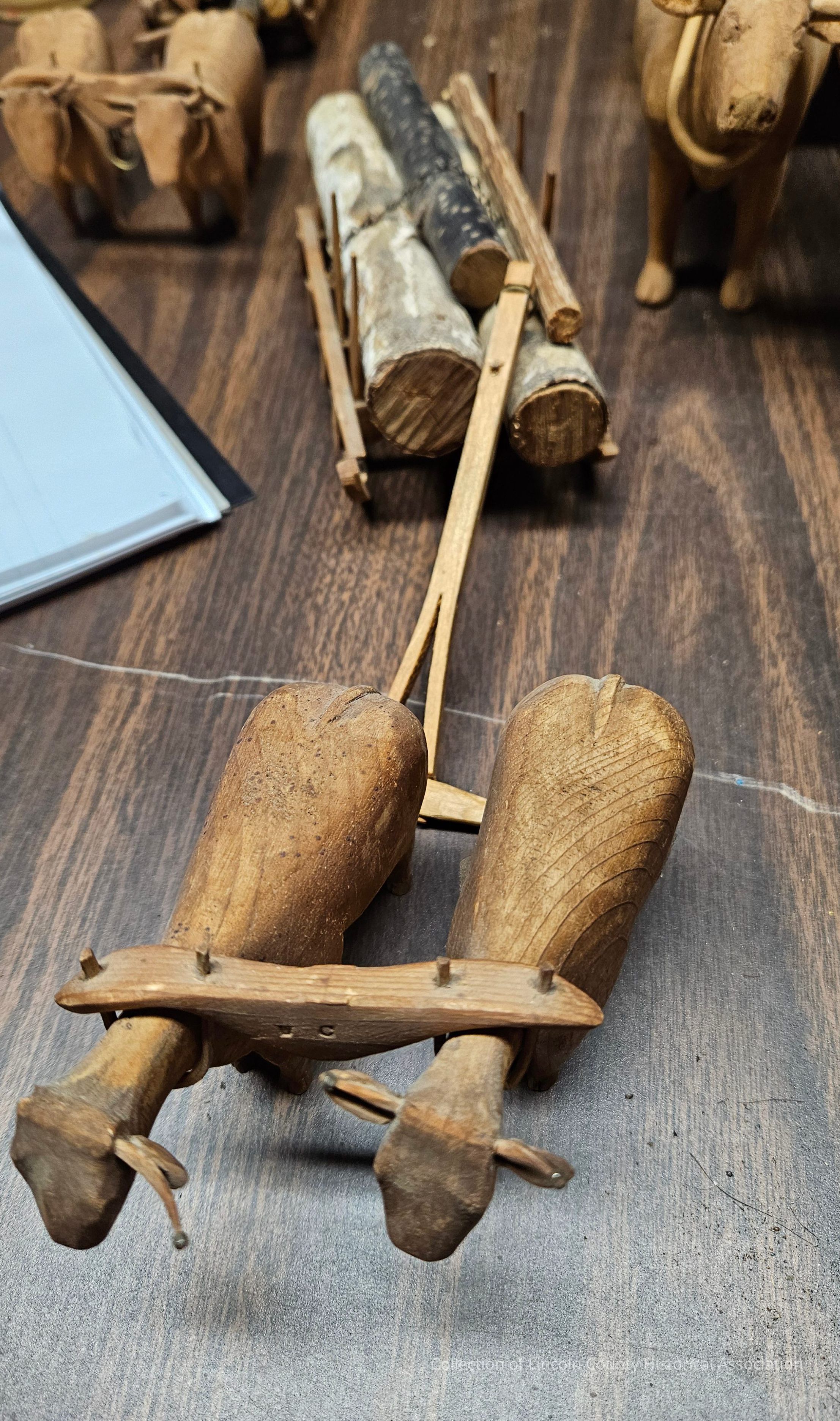 Wooden carving of a pair of yoked oxen pulled a sled with logs.Made/Created