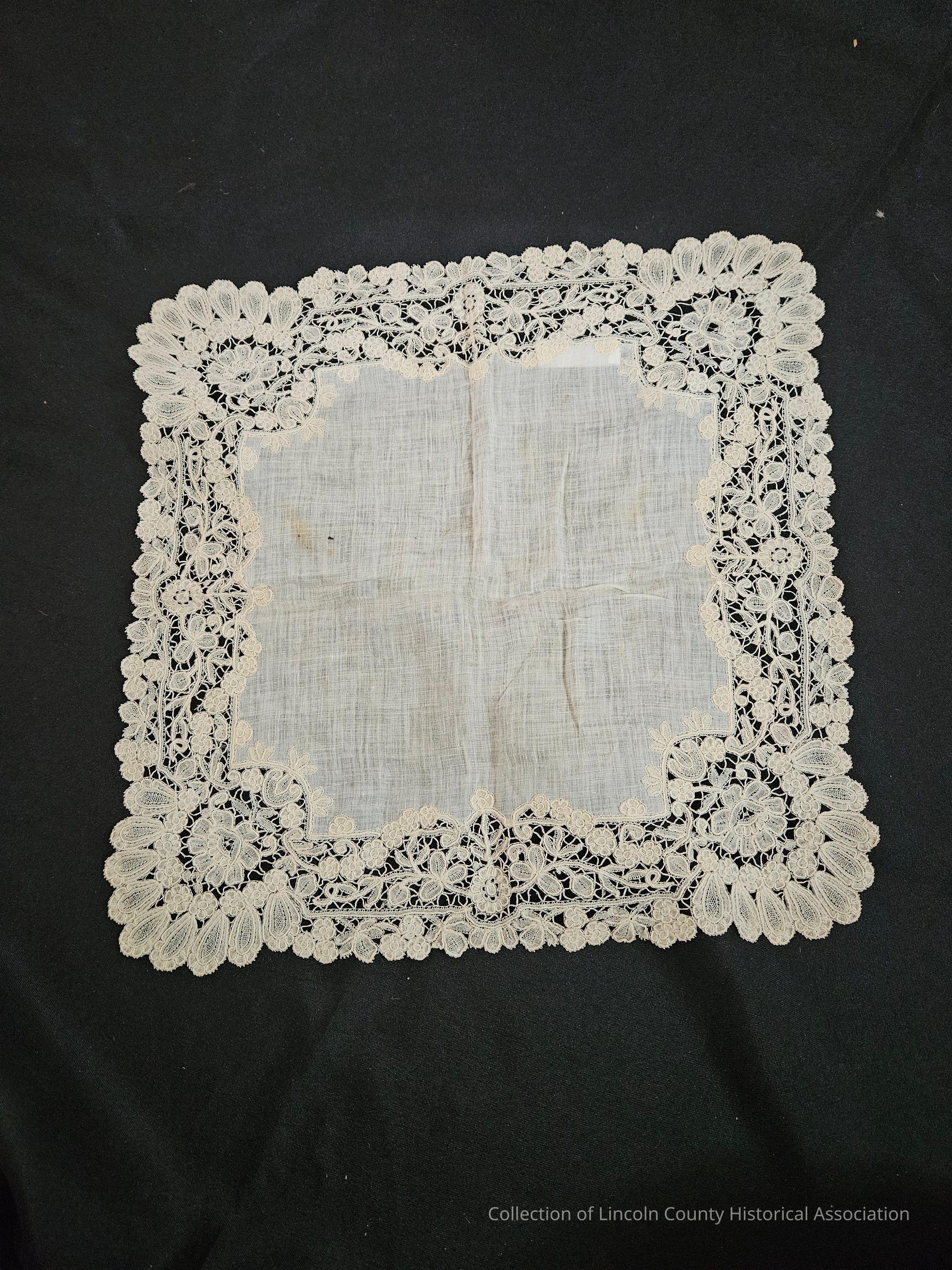 Square white cotton handkerchief with lace edging. Hand made lace.Clothing/Dress/Costume Details