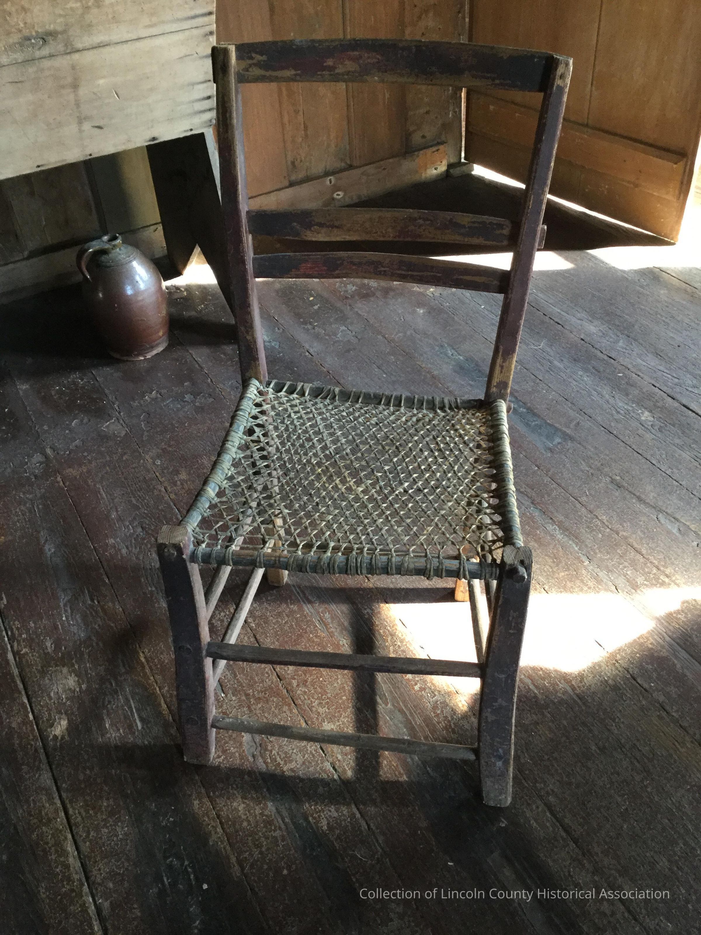 Wood with rawhide strips creating seat. Rawhide possible moose hide. Ladderback style and painted redMade/Created