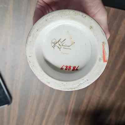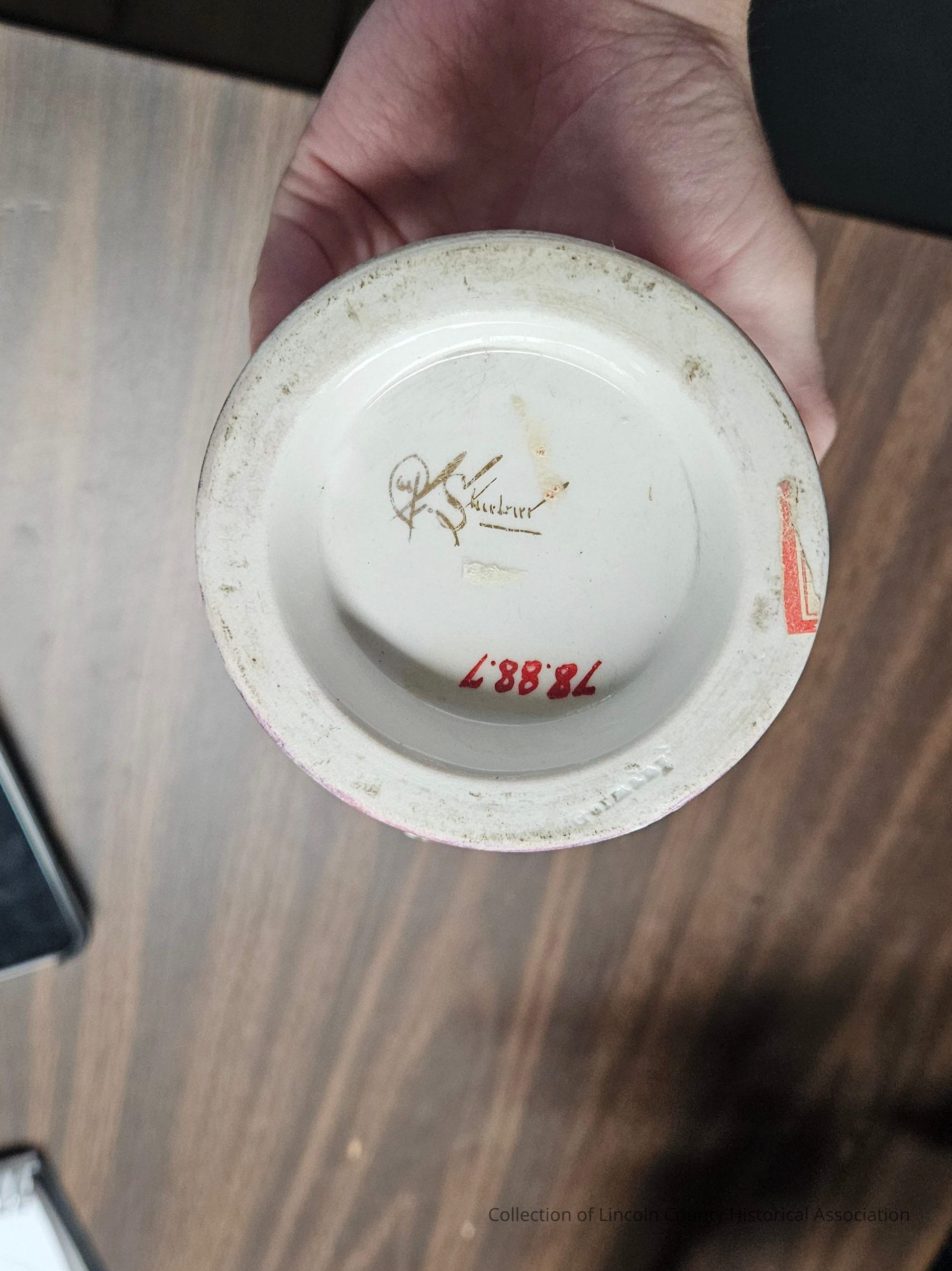 Pink shaving mug with gold trim. Center is a white background with pink and blue flowers surrounding fancy gold lettering that reads: "Thos. Y. Rolla." White handle.