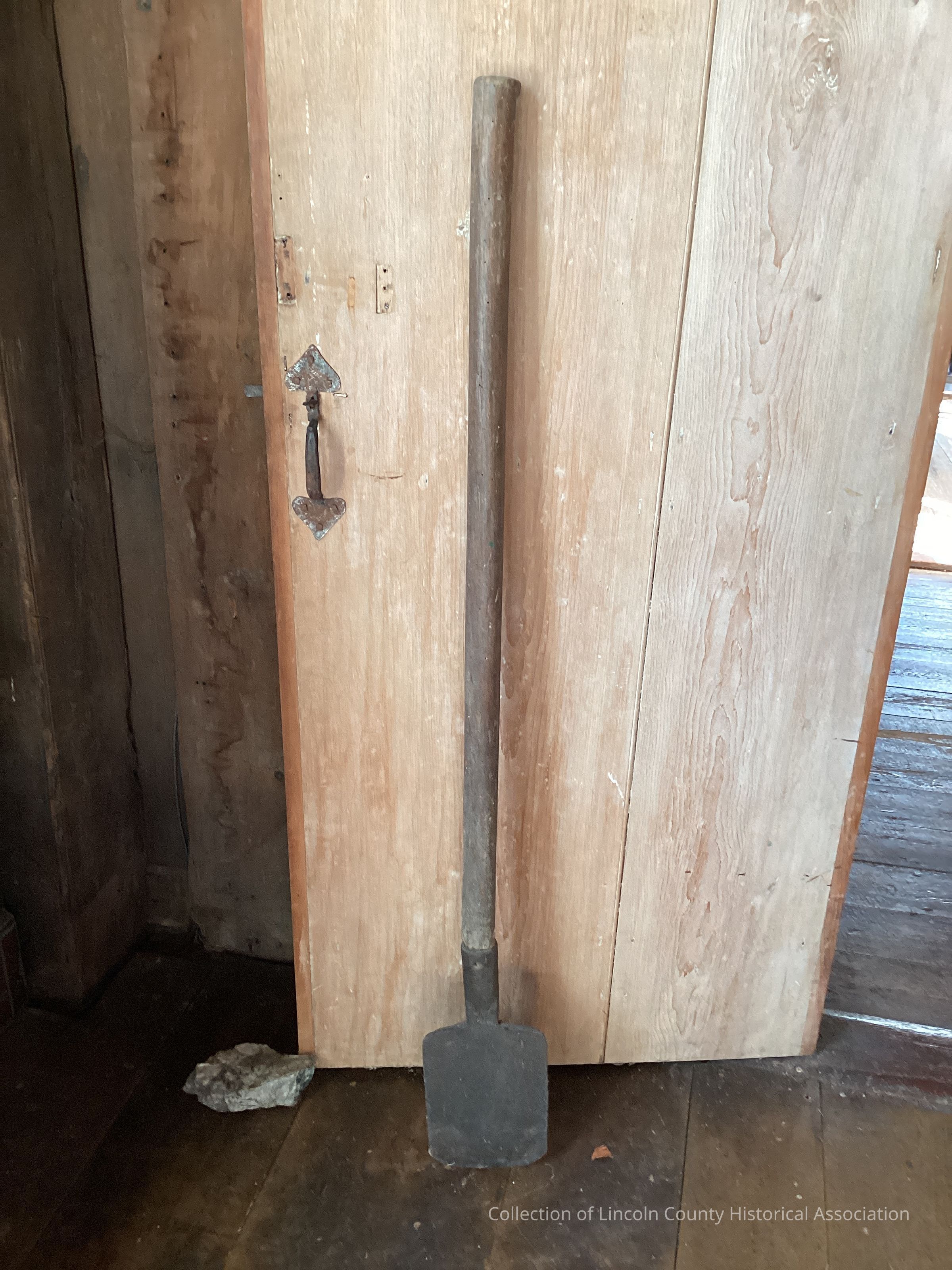 Wood and iron ice chisel. Wide iron chisel on a long heavy wooden handle