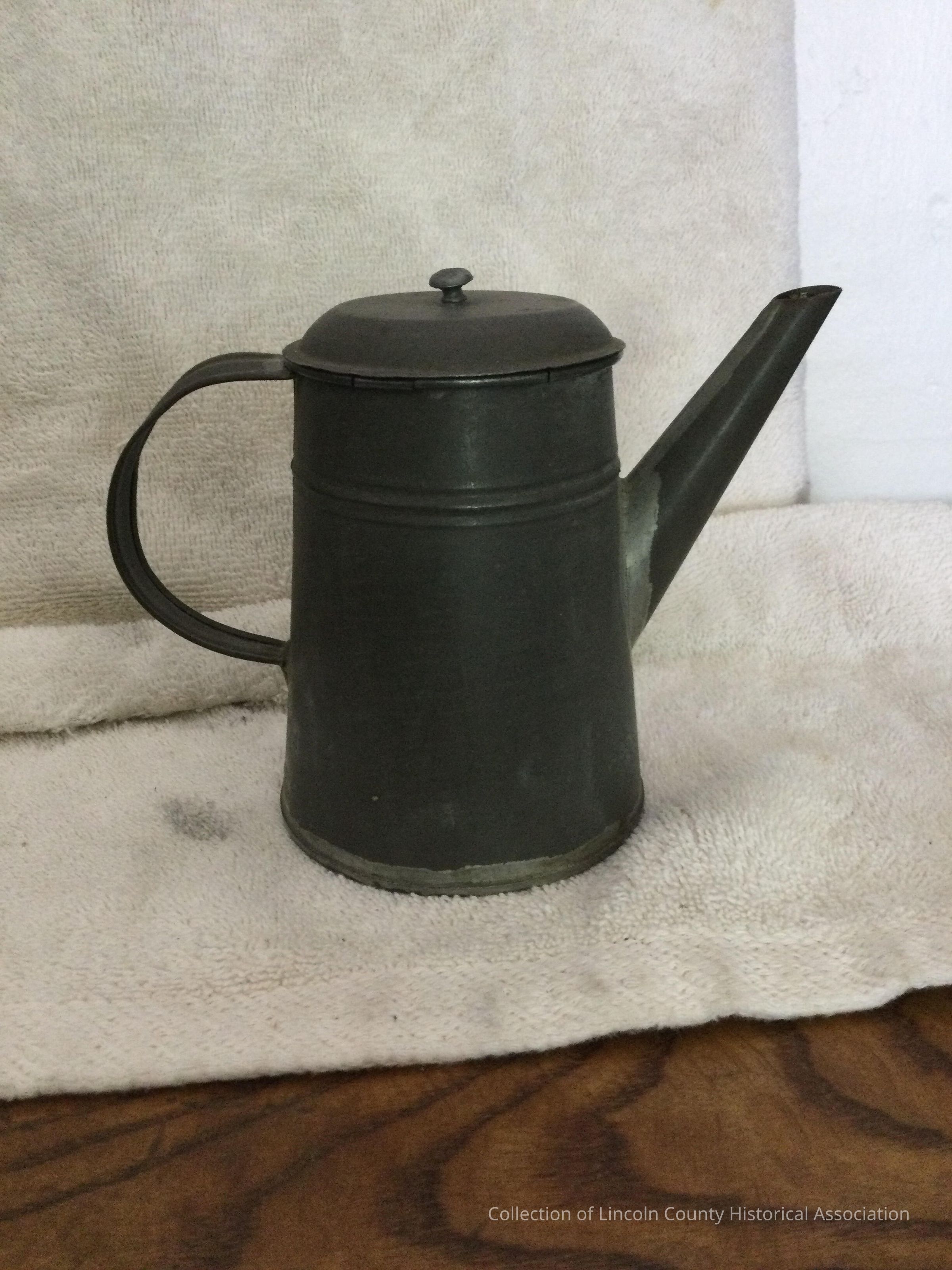 Tin coffee pot with its lid. With long attached tapering spout and a looped handle. Knob at center of lid.Made/Created