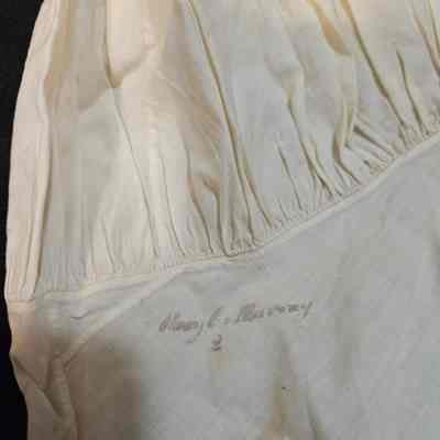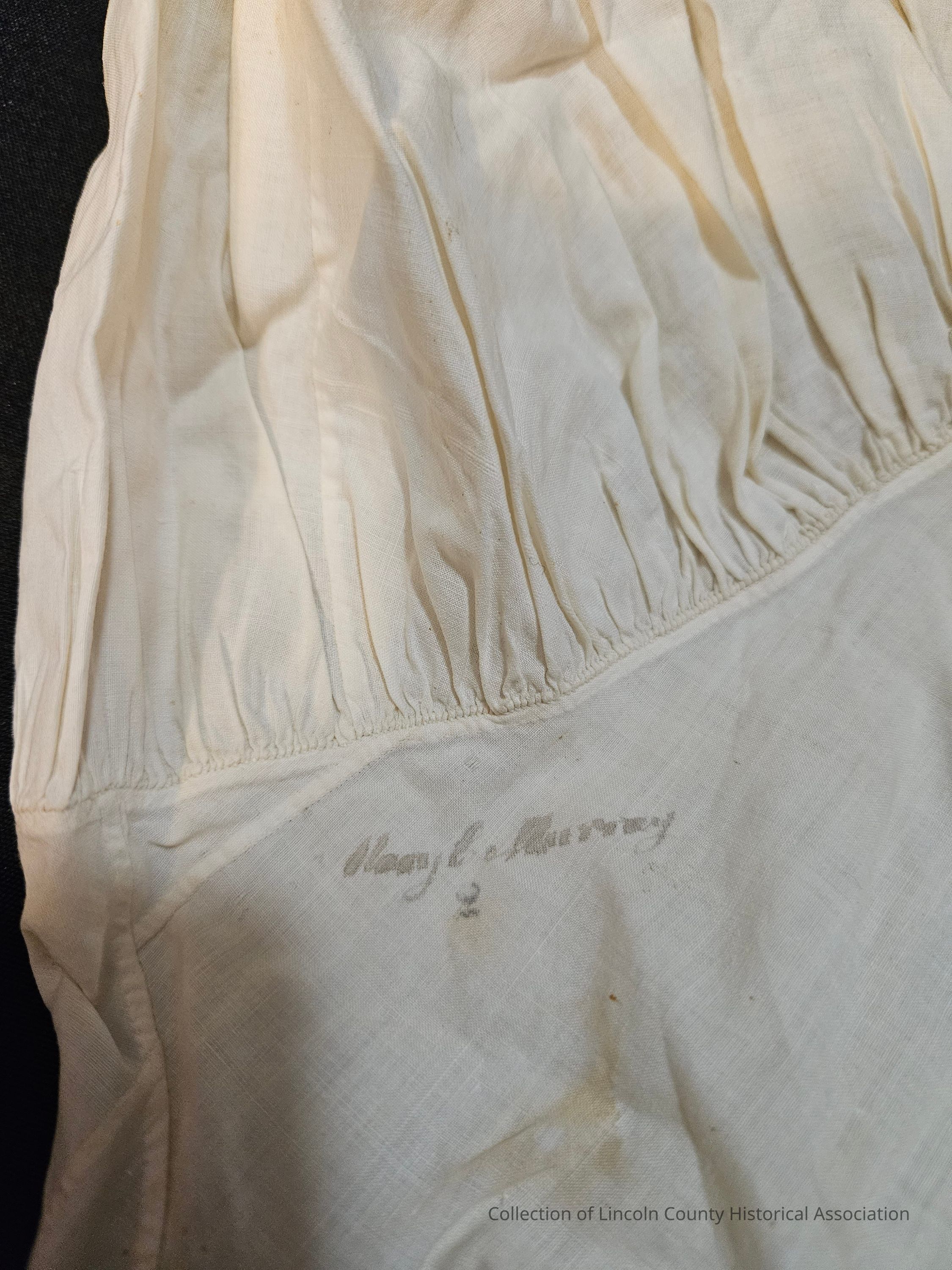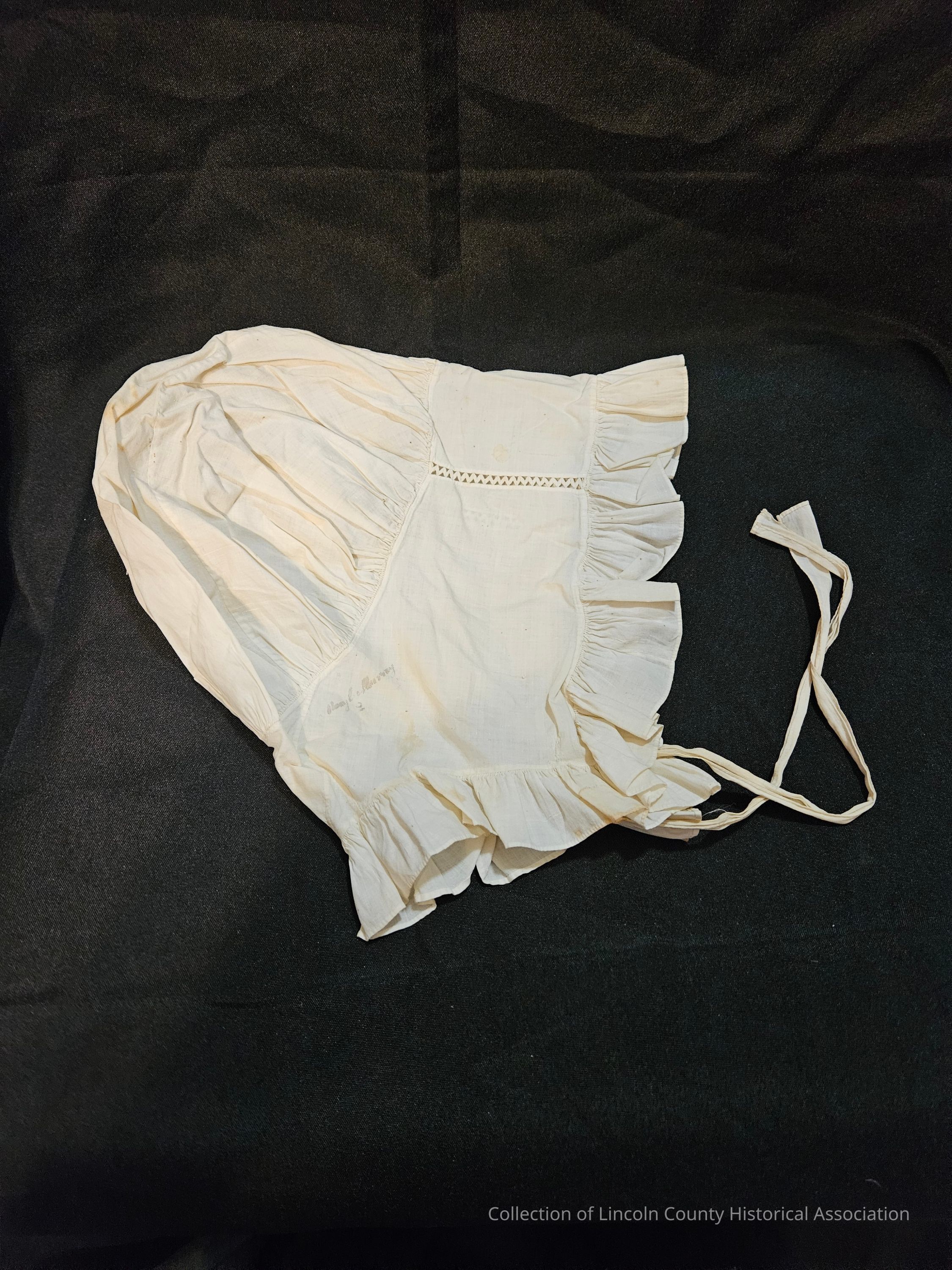 Women's white cotton day cap. Ruffled edging. Two zig-zag inserts at the top of head. Two plain cotton ties. "Mary C. Murray 2" written on back of cap.Clothing/Dress/Costume Details