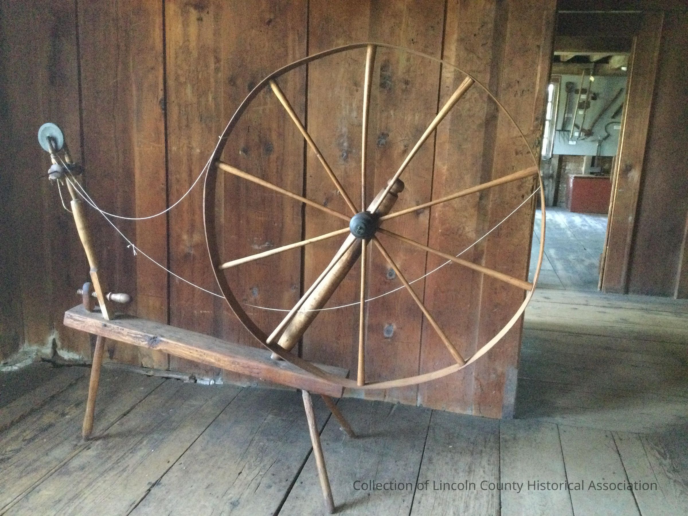 Walking spinning wheel, mostly made of oak but with metal elements. Wooden plank supported on three legs. Wheel with ten spokes. Miner's head spindle