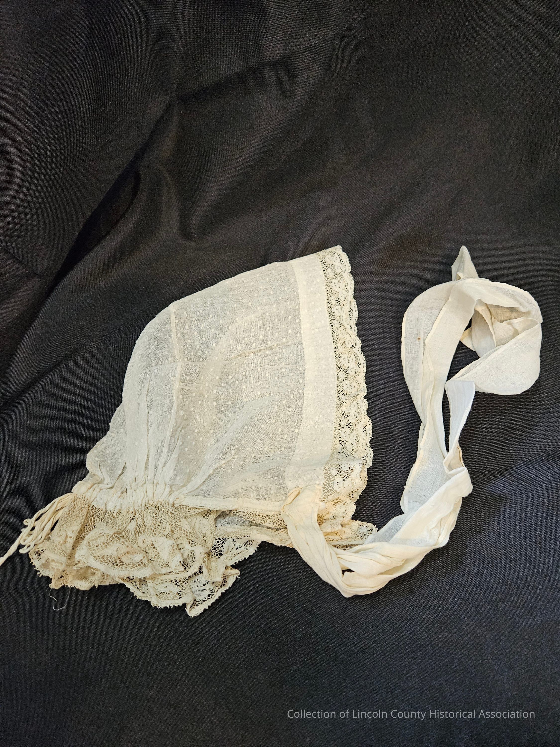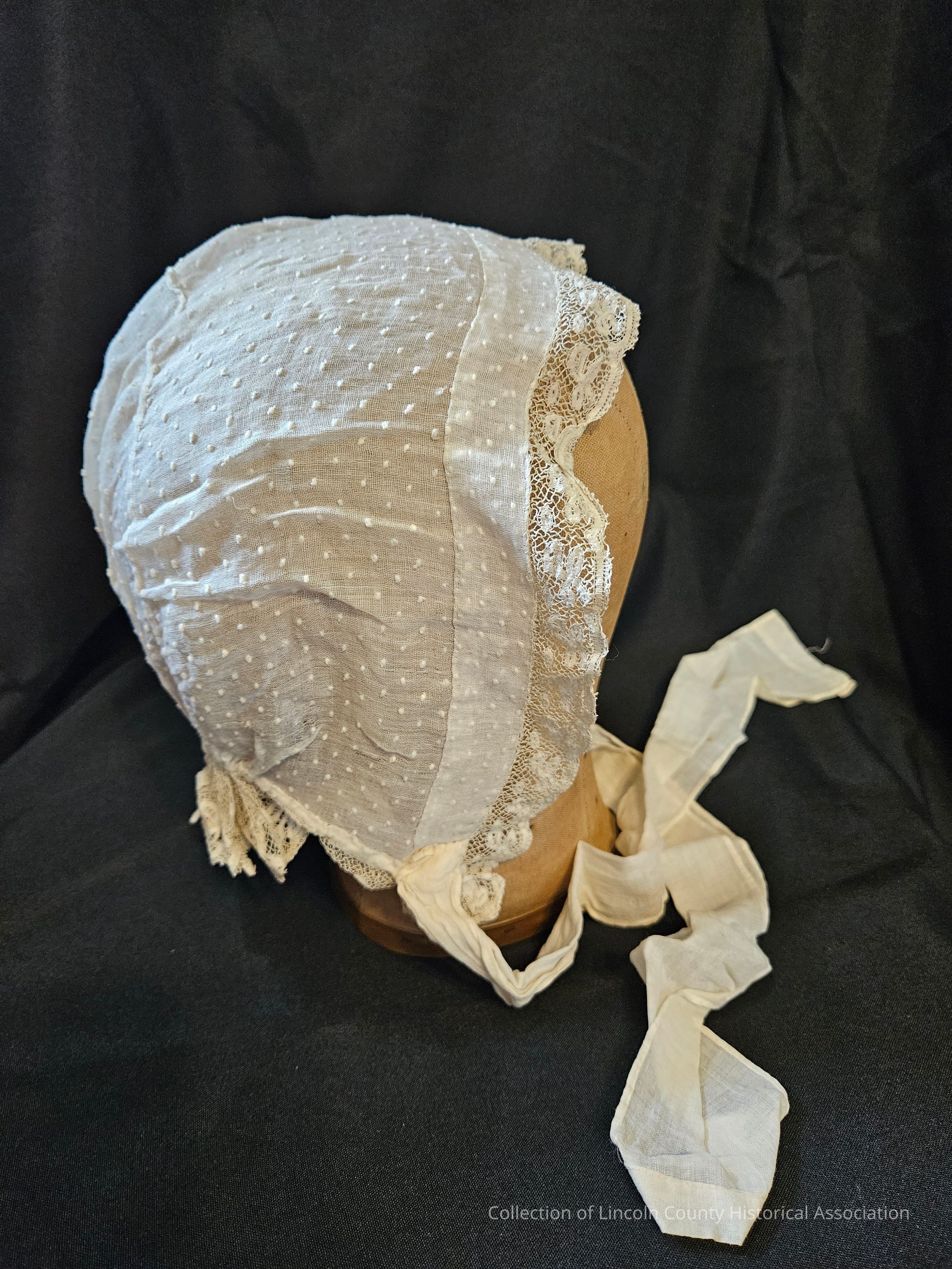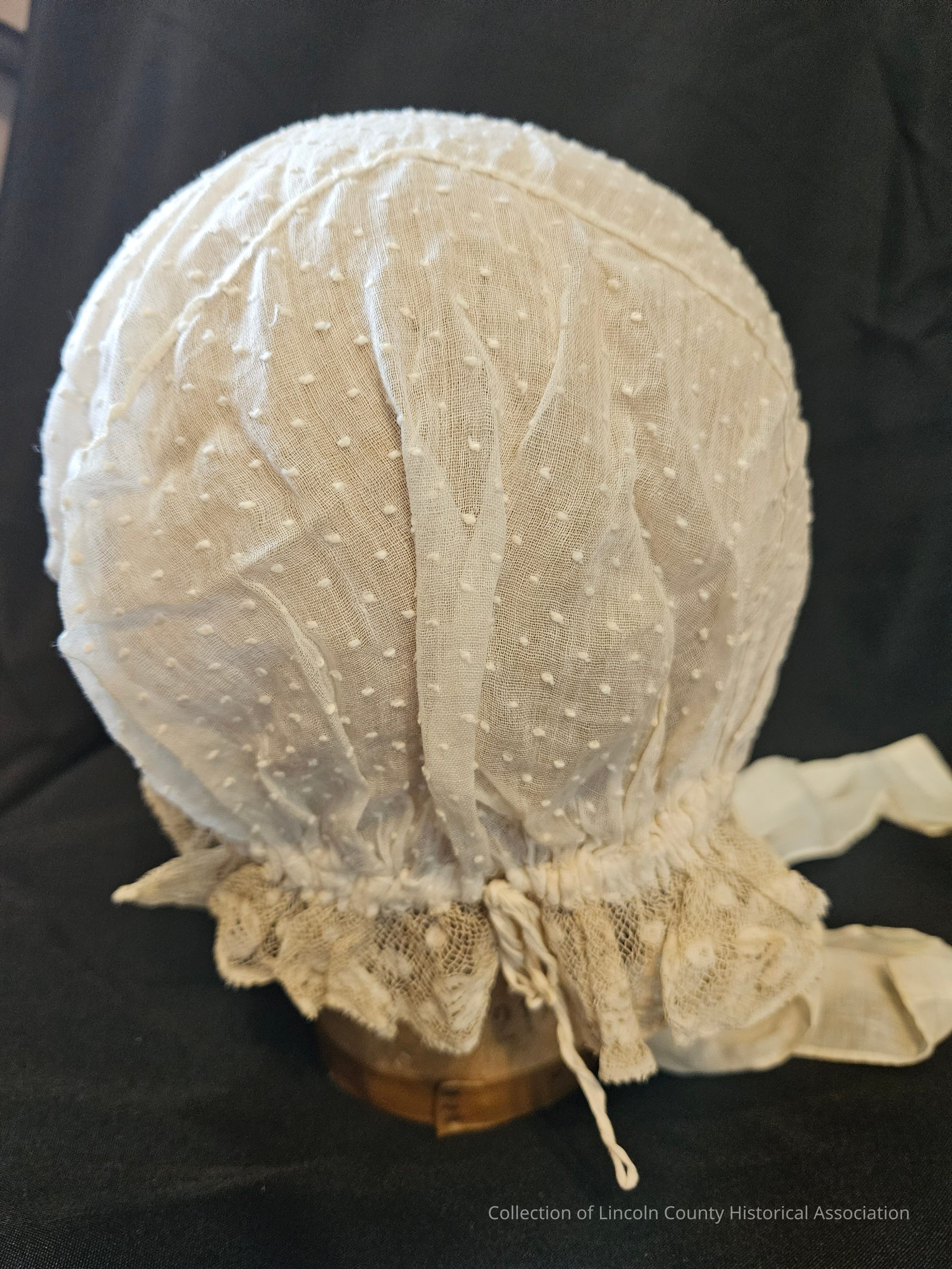 Woman's white cotton cap. Raised dot design. Scalloped lace edging. Adjustable string around base of neck. Two white cotton ties.