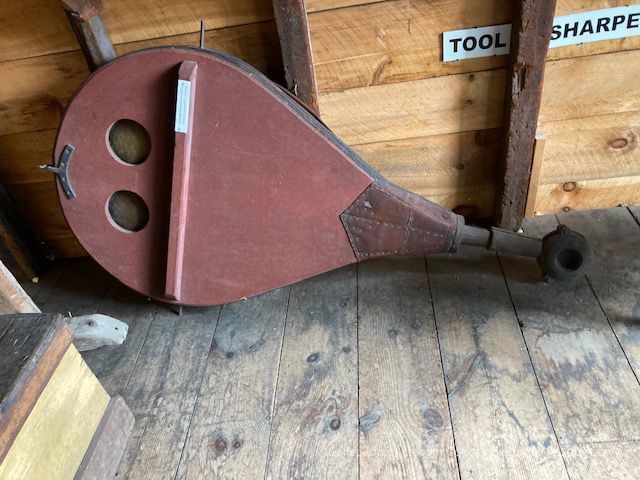 Blacksmith's double bellows constructed with wood and leather and with its iron shaft ending in a duck's nest. The duck's nest would have projected directly into the fire box.Made/Created