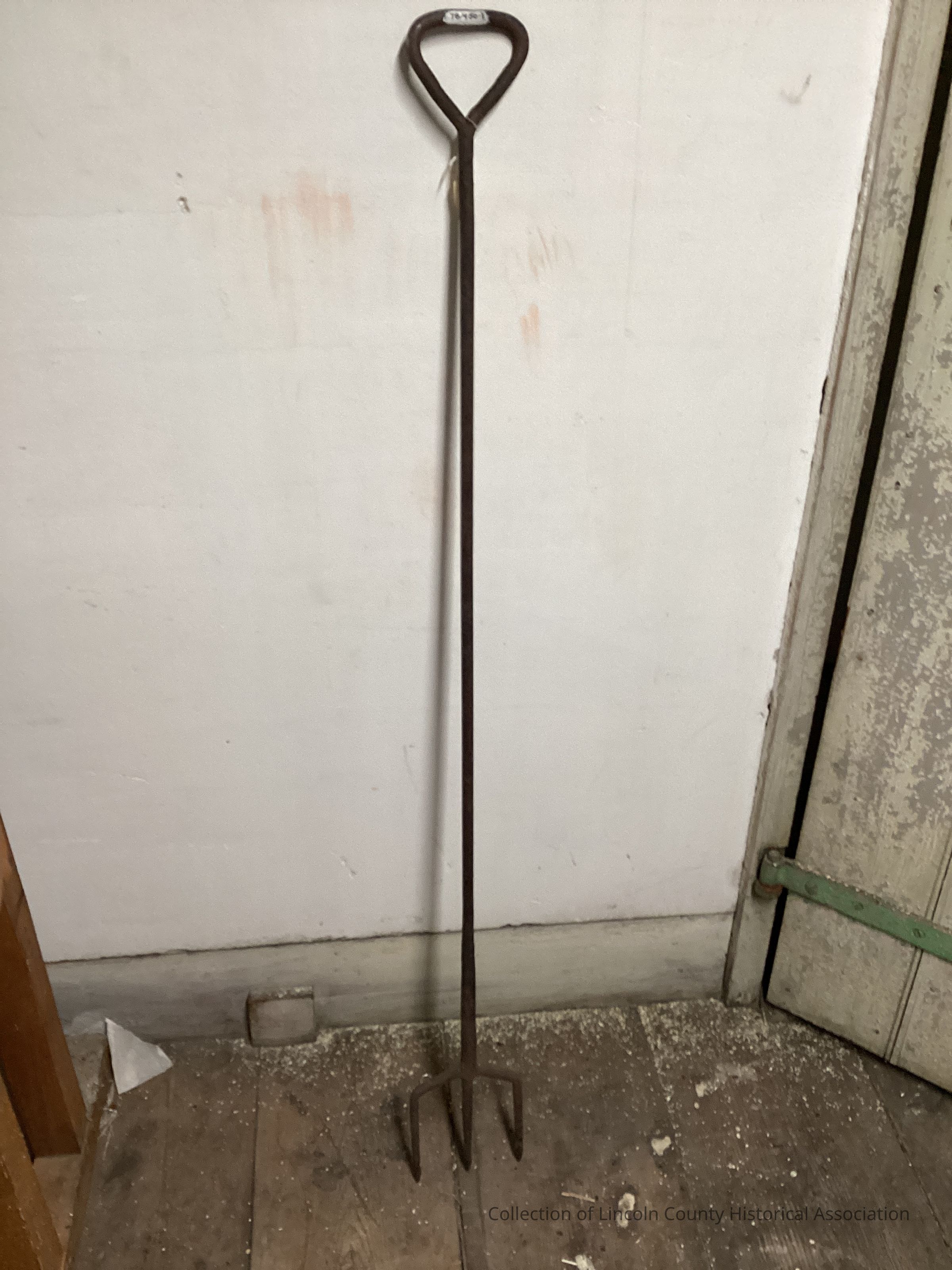 Wrought iron trident fork ending in three barbed tines and with a triangular shaped stirrup handleMade/Created