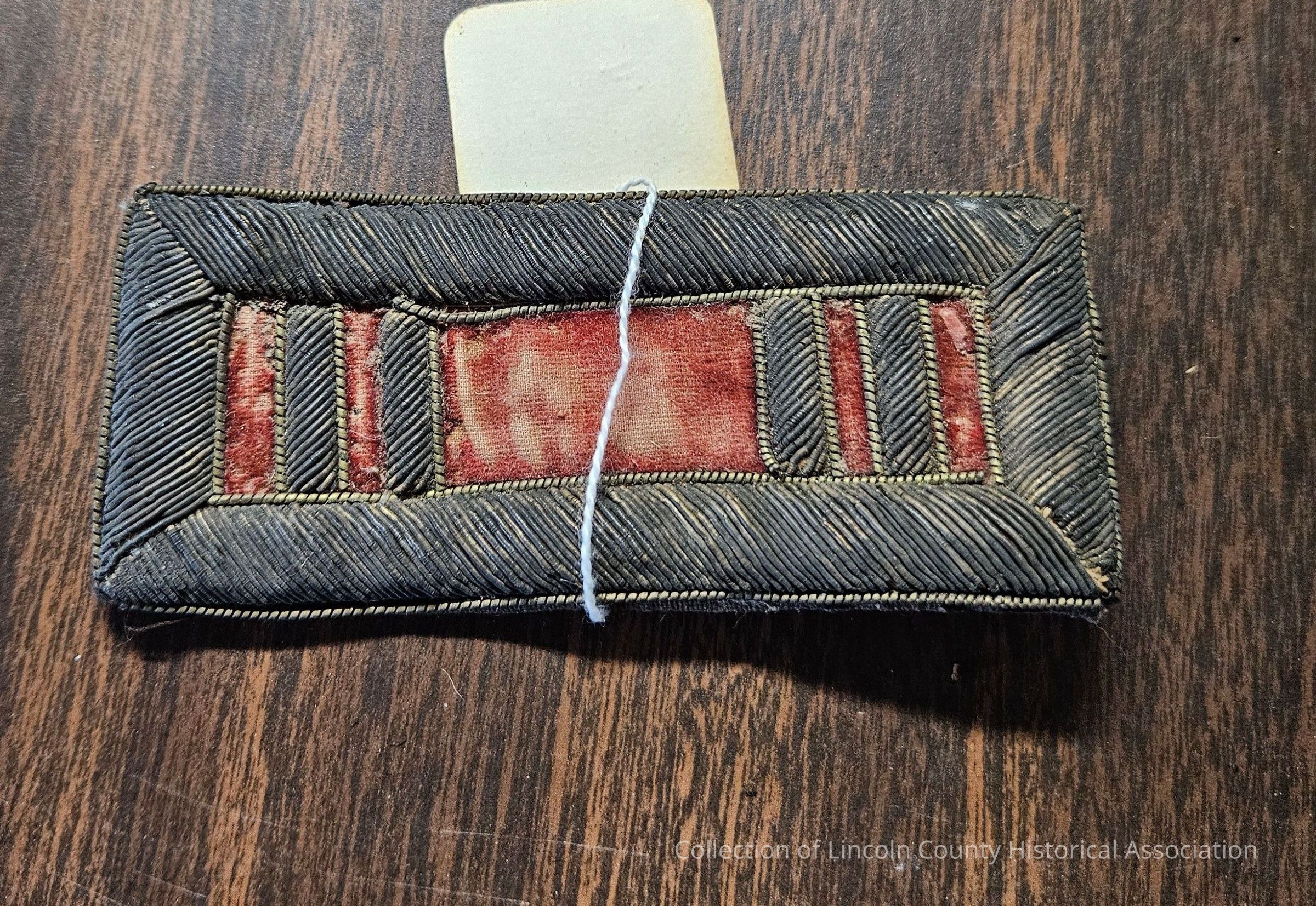 Civil War shoulder patch for artillery captain. Rectangular in shape with blue trim surrounding red rectangle with four blue bars within.Made/Created