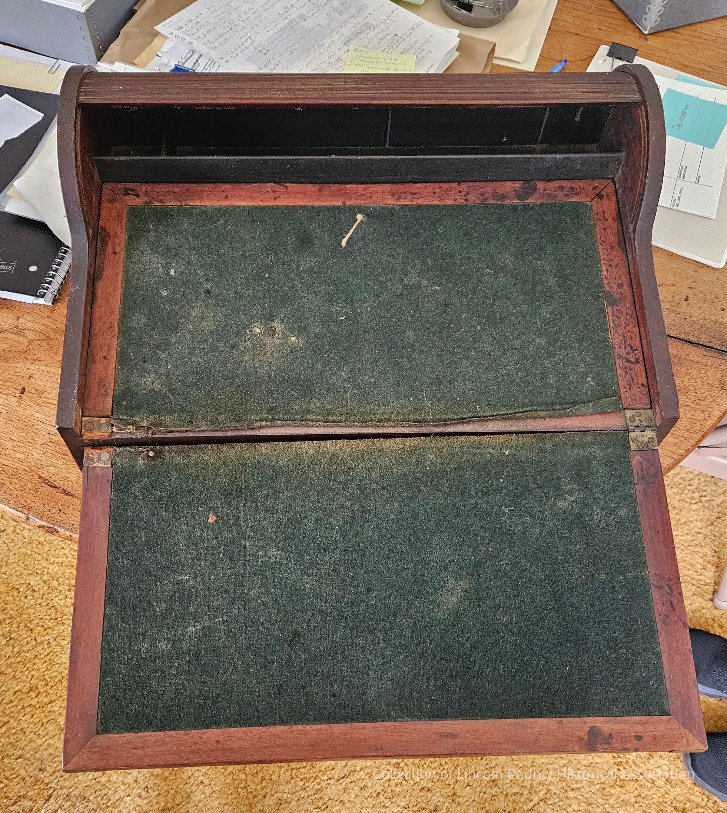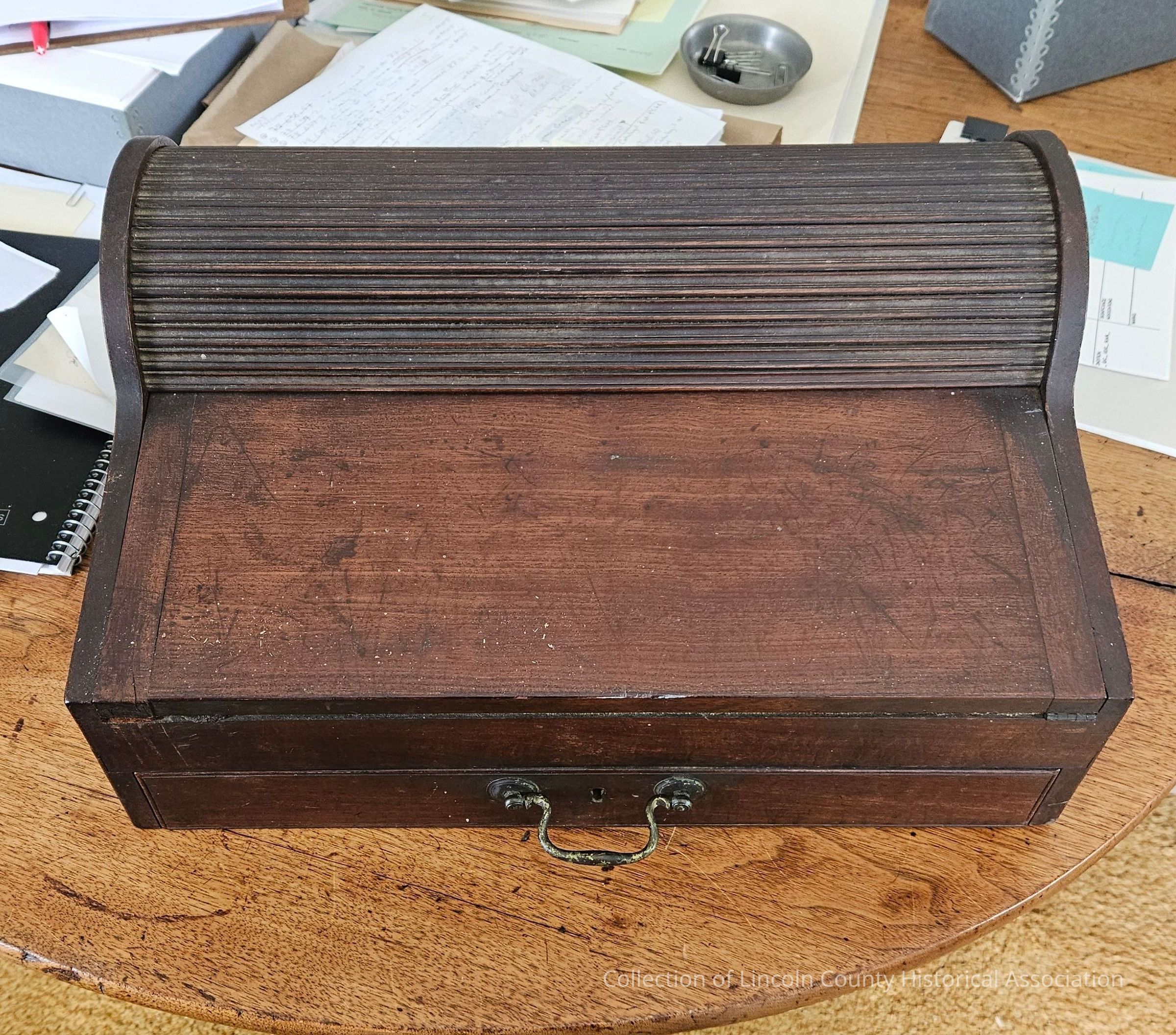 This desk belonged to Jonathan Edwards Scott (1812-1886), a ship captain who lived on high street in Wiscasset. Jonathan's first wife was named Joanna Oram Parsons Scott (1815-1852) and she died in March 1852. They had two daughters, Helen and Fannie (1850-1912). Jonathan then married Eliza Ann Clark (1850-1912) and they had a son named Henry. Jonathan turned over command of his ship Emily McNear to his brother and retired in 1871.