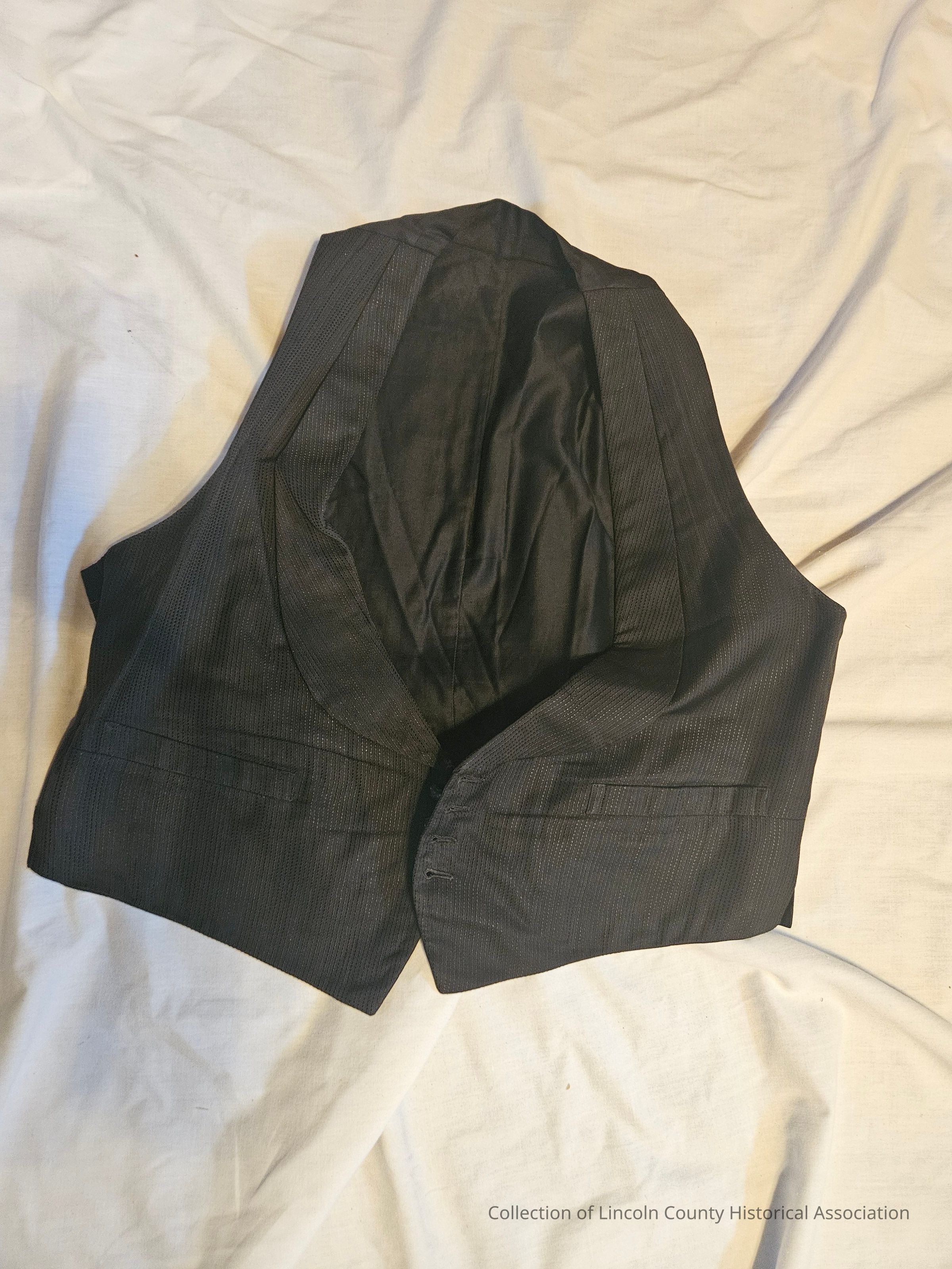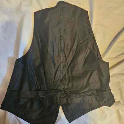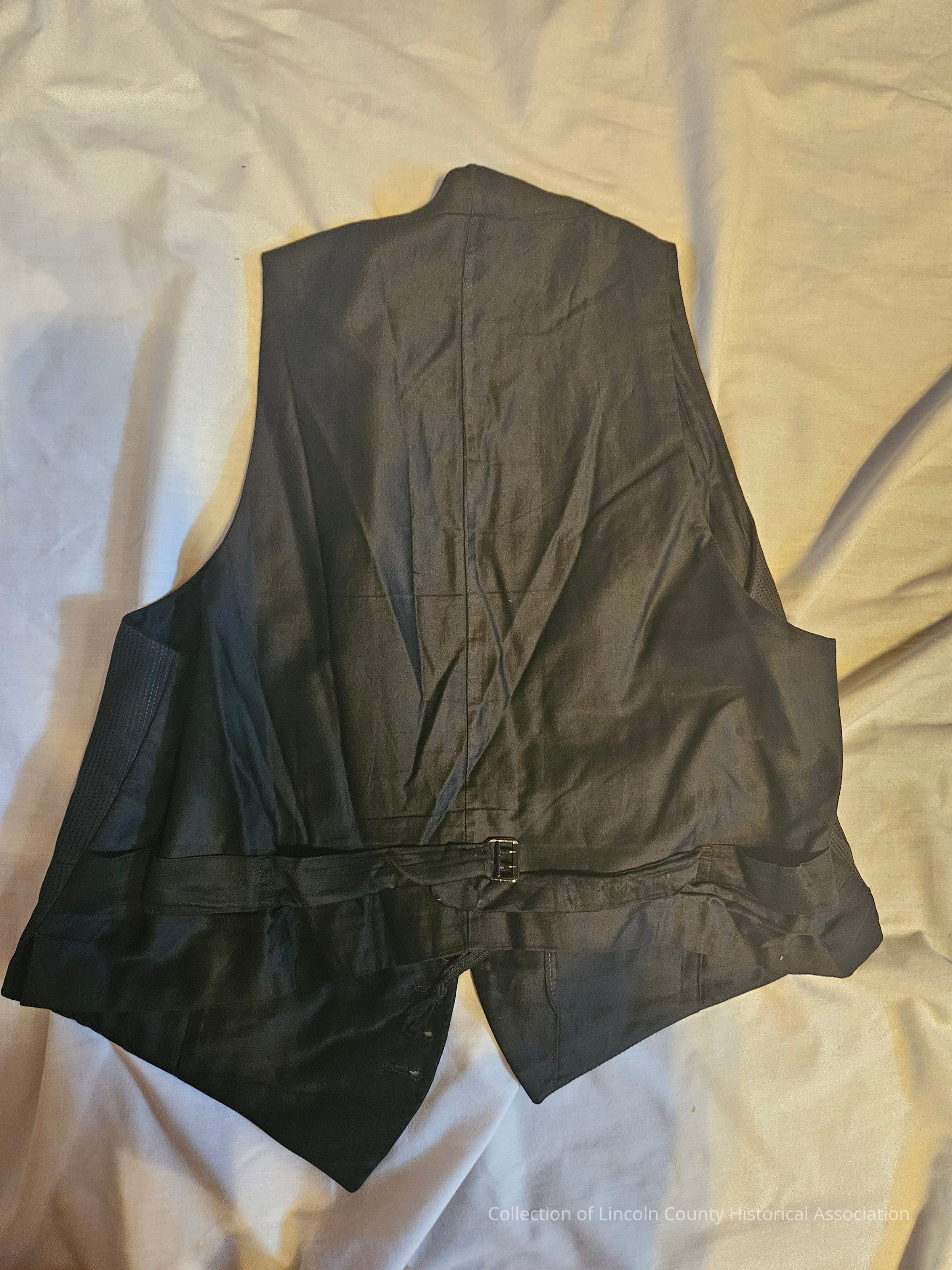 Men's black suit vest. Striped silk front and plain black silk back. Two waist pockets and four buttons. Shawl collar. Buckle at back waist.