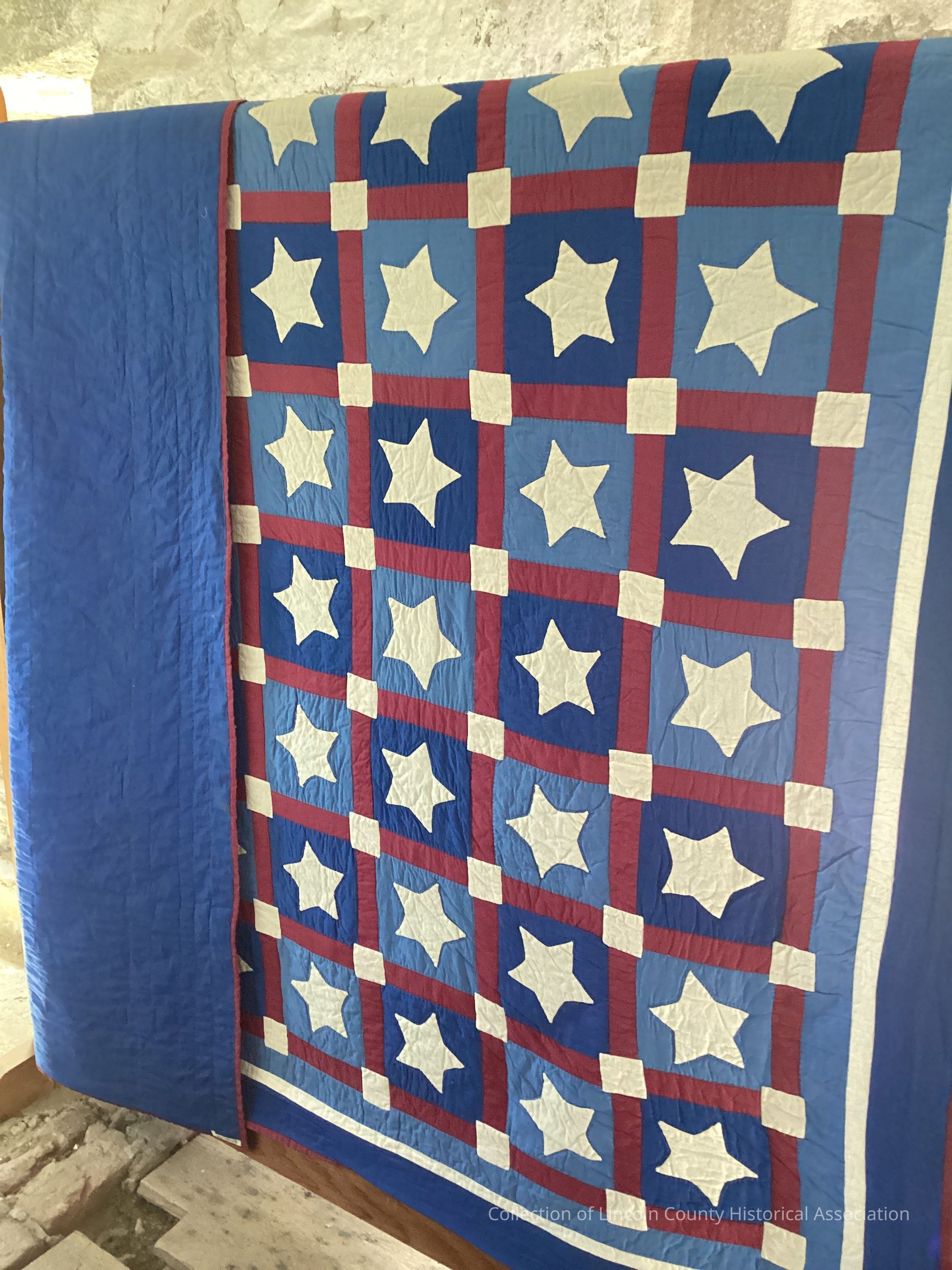 Quilt with white five pointed stars on blue background separated by red bands intersected by small white squares. Back of quilt is dark blue. Edged with red.Made/Created