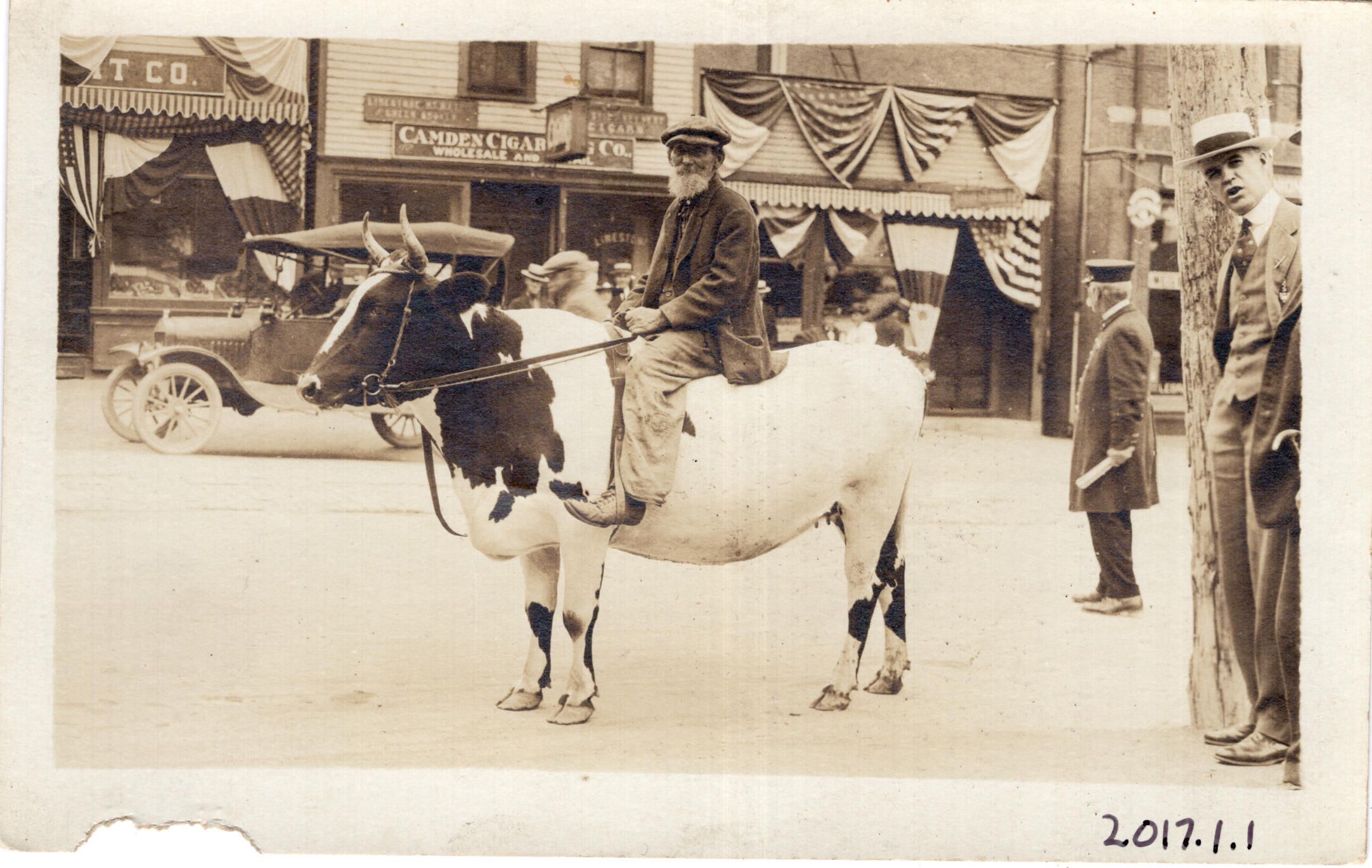 photo of man astride a black and white, horned cow, on Camden's Main Street, shop in background of "Camden Cigar...." Patriotic bunting display indicates a parade. Model T? in background