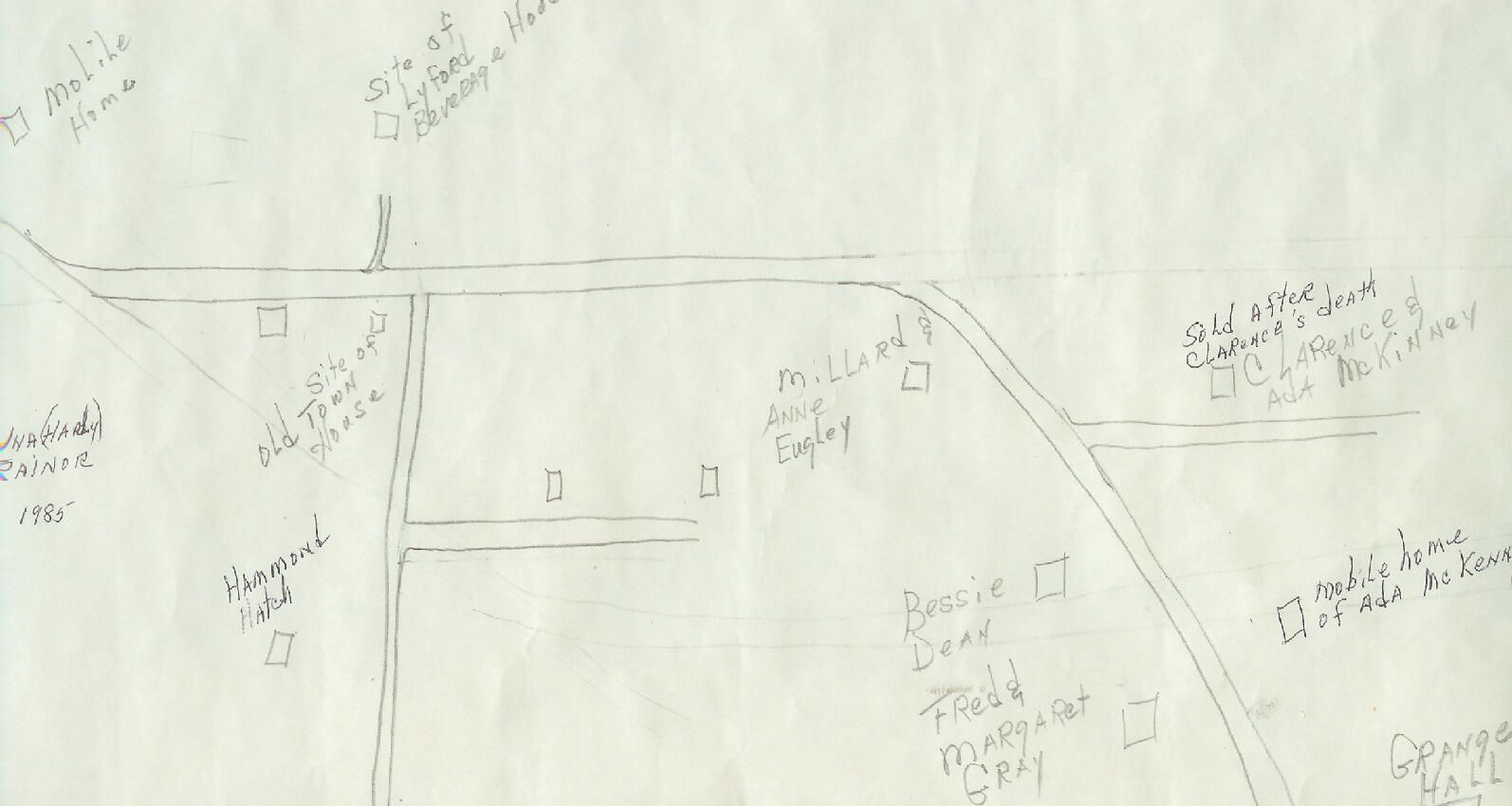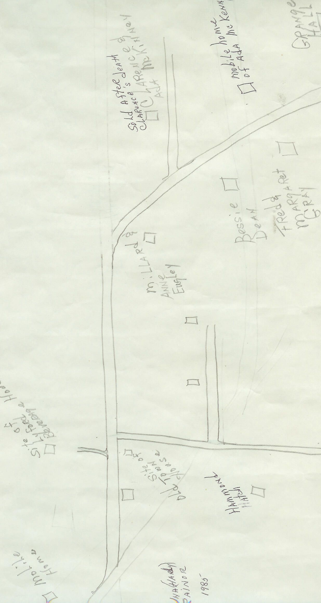 Hand-drawn map of Millertown area, it's houses and names of the inhabitants.