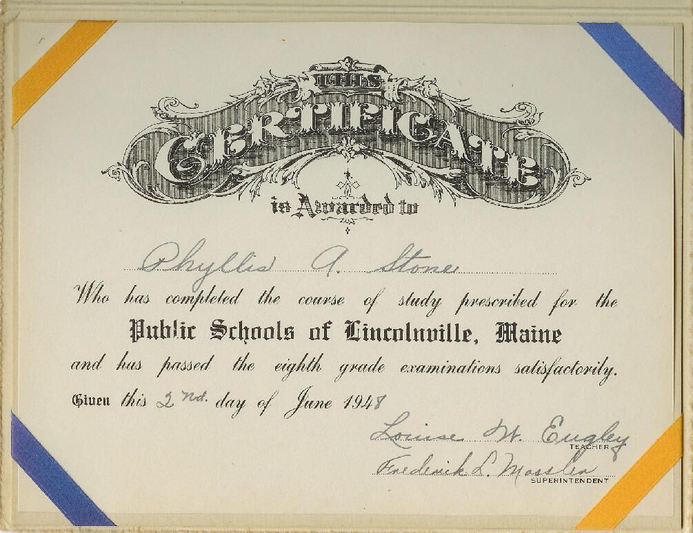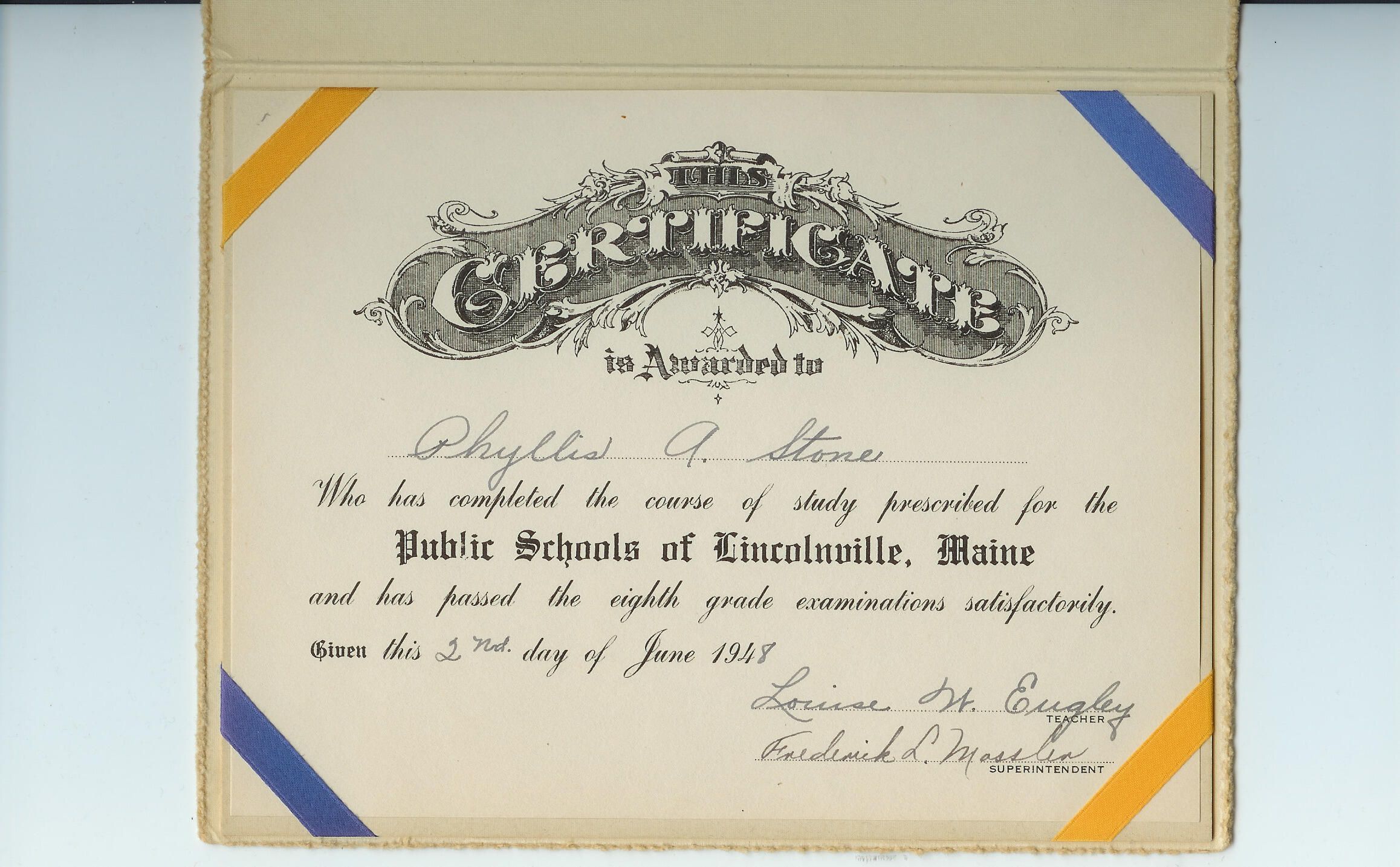 Phyllis Stone certificate of completion from Lincolnville Public Schools.