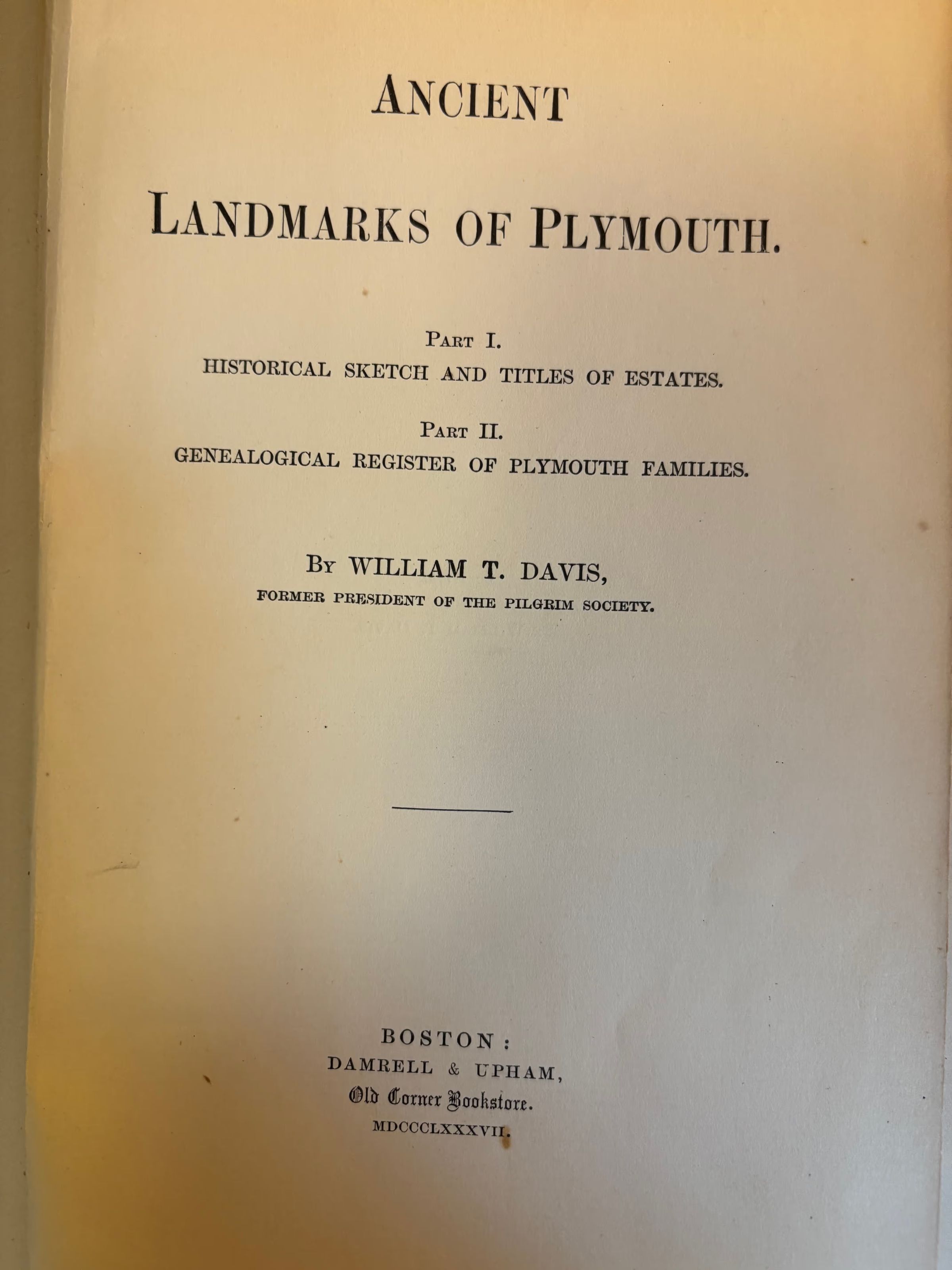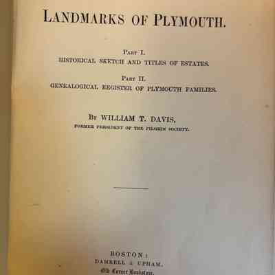 Hard cover book with 308 pages containing an indexed account of early settlers of Plymouth , Massachusetts.Relationships