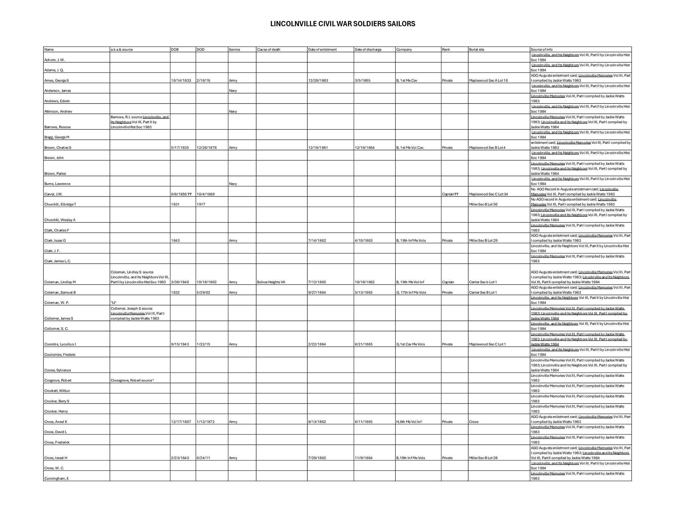 List of Lincolnville Civil War Soldiers & Sailors; compiled by Lizz Laycock from various sources