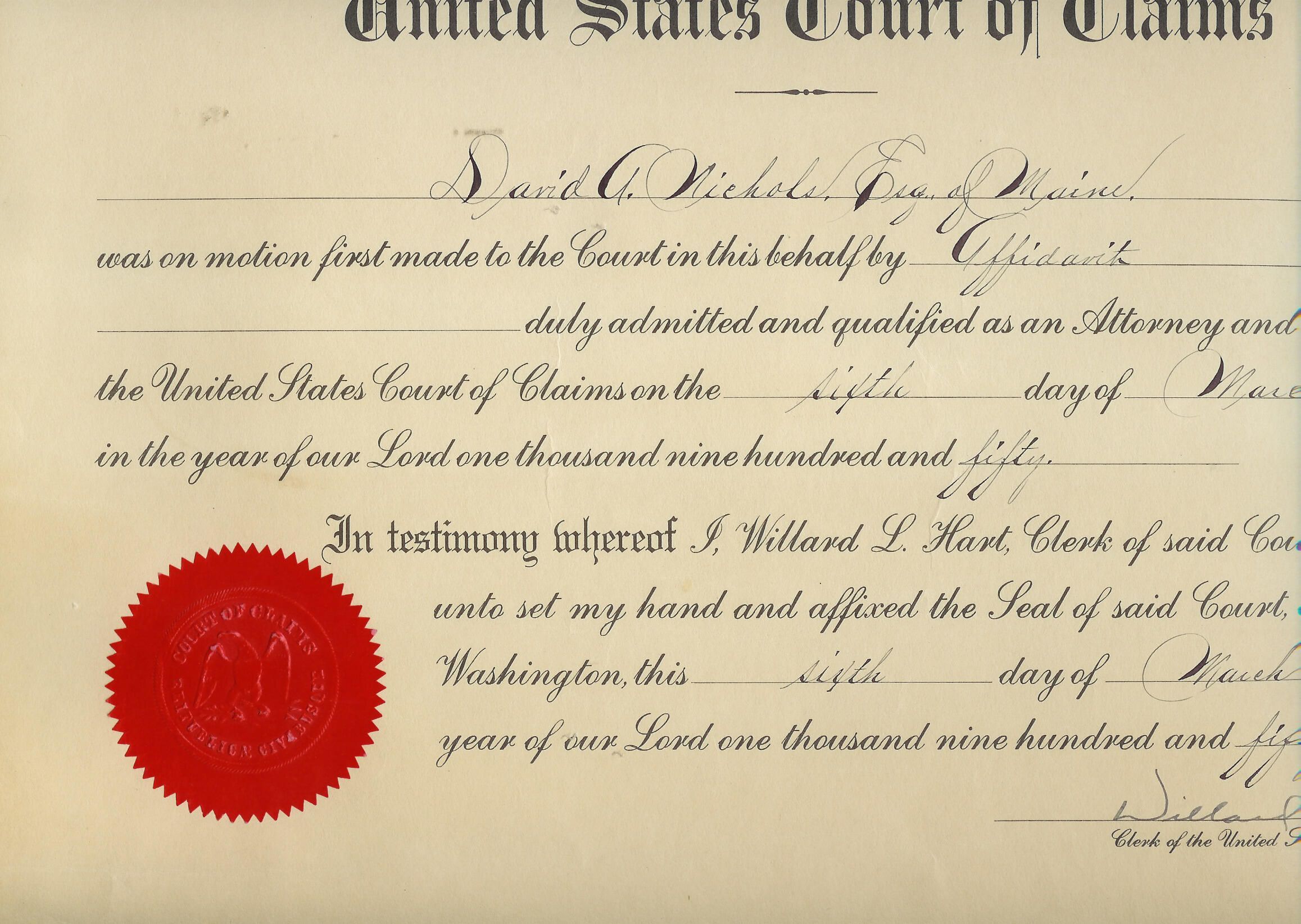 United States Court of Claims certificate admitting D.A.N. "as an attorney and counsellor of the United States Court of Claims" dated March 6, 1950, 10"x14.5" with red embossed sealRelationships
