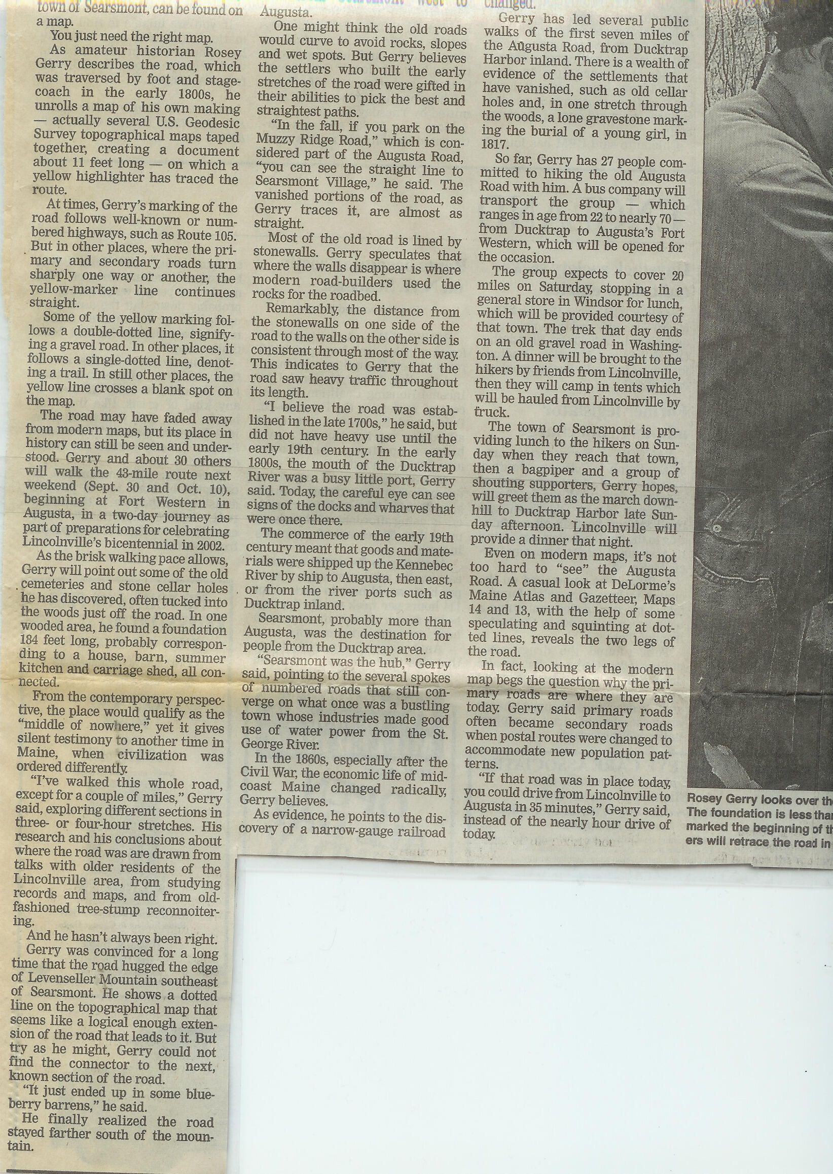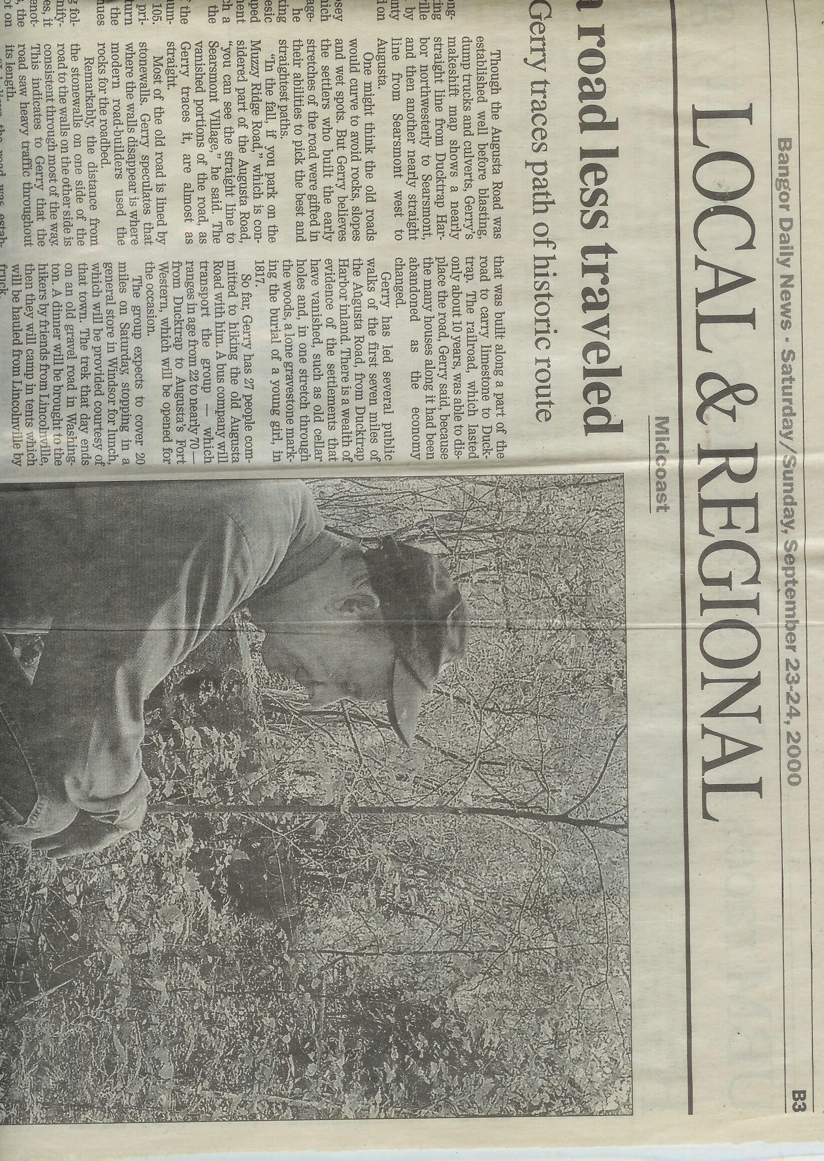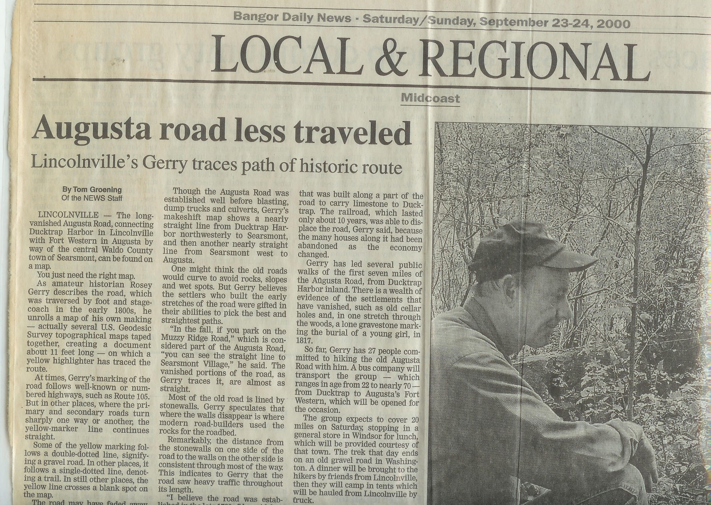 Bangor Daily News article, September 23-24, 2000 on the Augusta to Ducktrap walk, featuring an interview with organizer Rosey Gerry