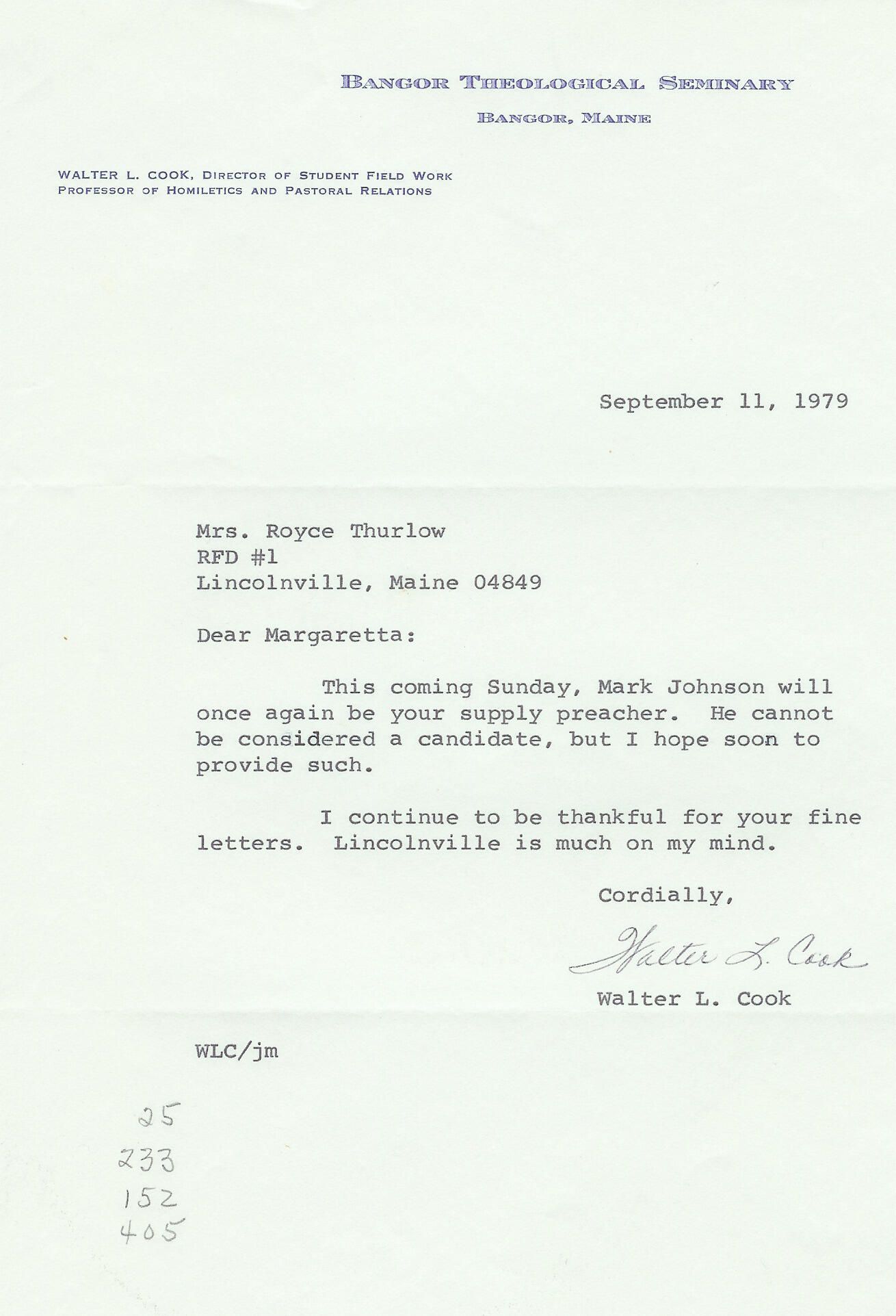 A collection of some 63 letters from Walter L. Cook, Director, Student Field Education at Bangor Theological Seminary to Margaretta Thurlow, and her responses to him. BTS was supplying pastors to United Christian Church during the years of the correspondence, 1967-1986, and Dr. Cook would introduce the next week's "supply" as the student pastors were called in a letter. During the week following the supply's stint in the pulpit, Margaretta would write a critique of the student's sermon, etc.
