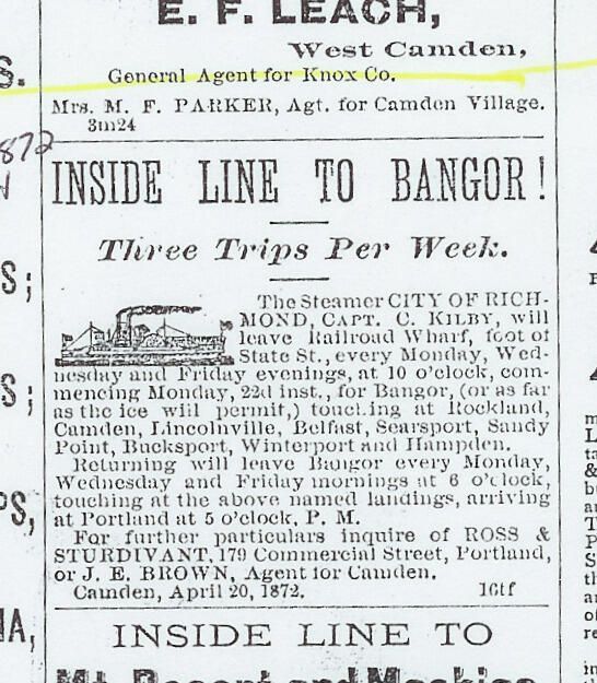 steamboat ad for the Bangor to Portland steamboat stop at Lincolnville; this is one of the few printed references to L'ville as a stop on a regular steamboat line/routeRelationships