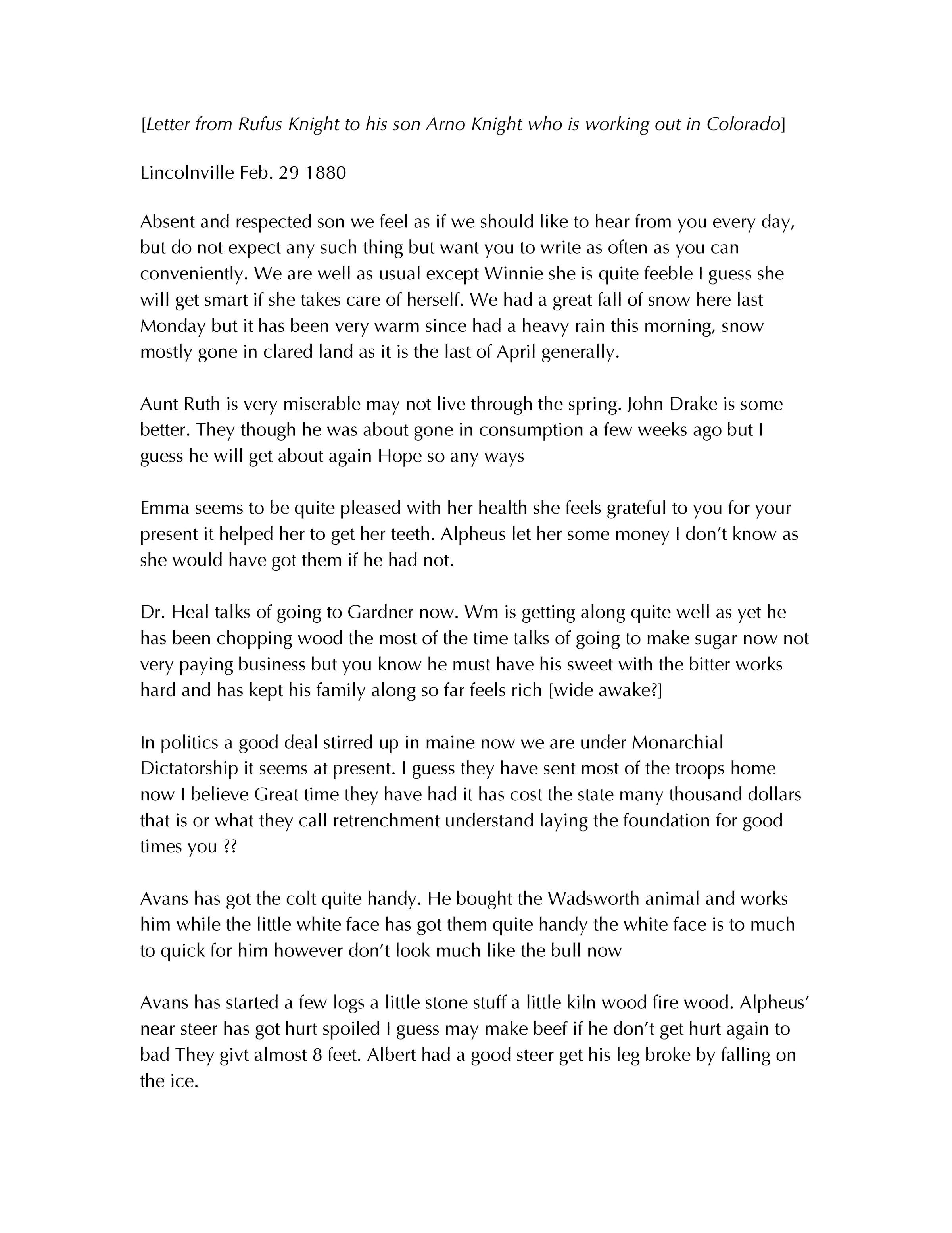 Knight Collection - 1880 Letter; Dated February 29th; Written by Rufus Knight to his son Arno Knight; Arno is working in Colorado; Transcription only, no original letter