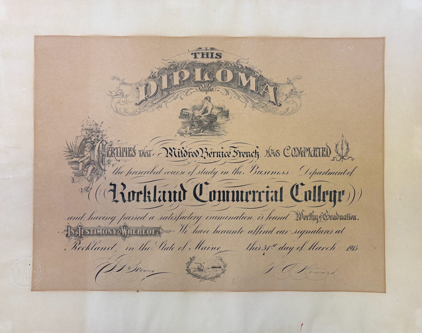Diploma from Rockland Commercial College to Mildred French 1915Entry/Object ID