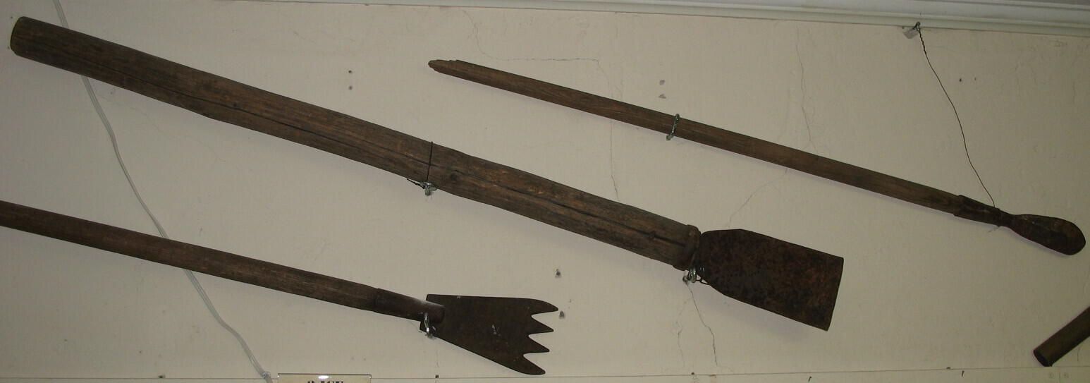 three different tools for cutting and lifting blocks of ice during ice cutting on local ponds