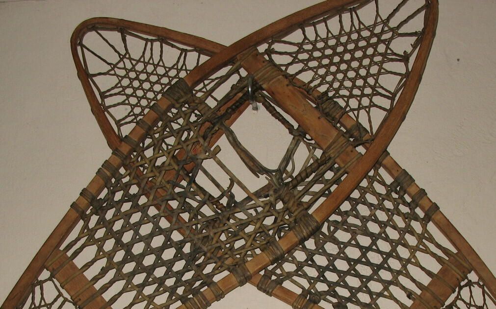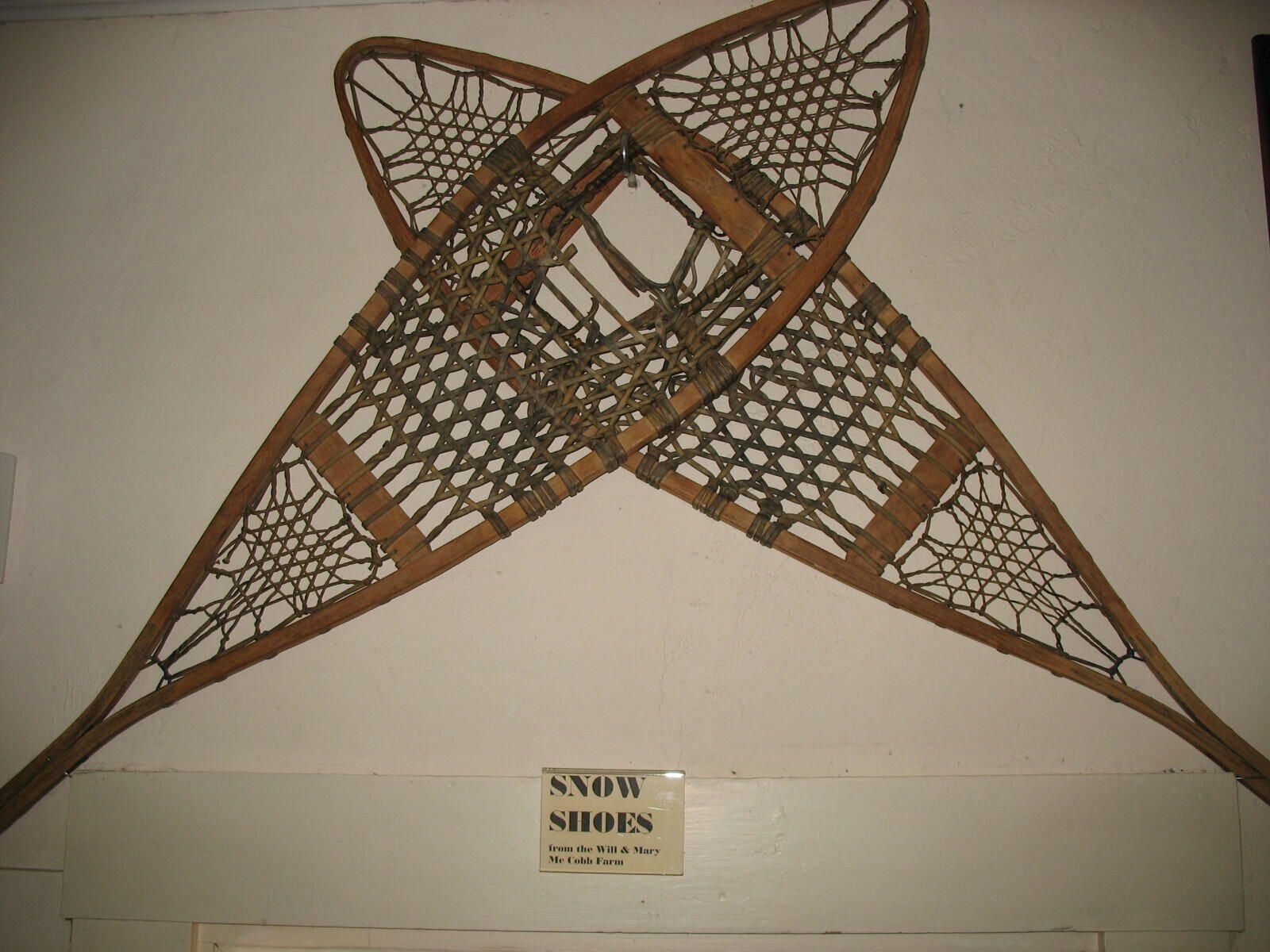 pair of wooden snowshoes, woven with rawhide these snowshoes came from the Willus.iam McCobb farm -- 369 Beach Road gift of Albert Mathieson