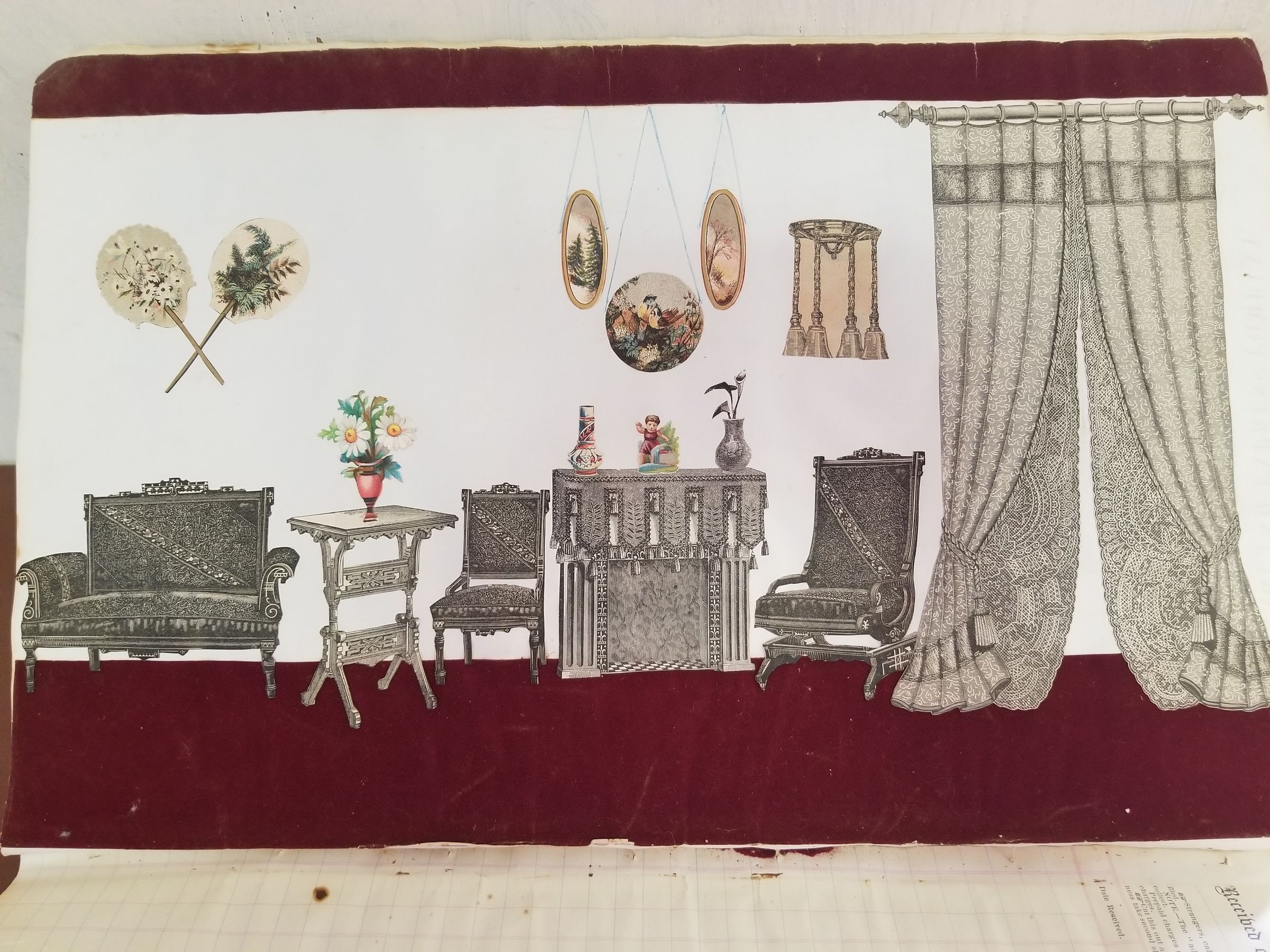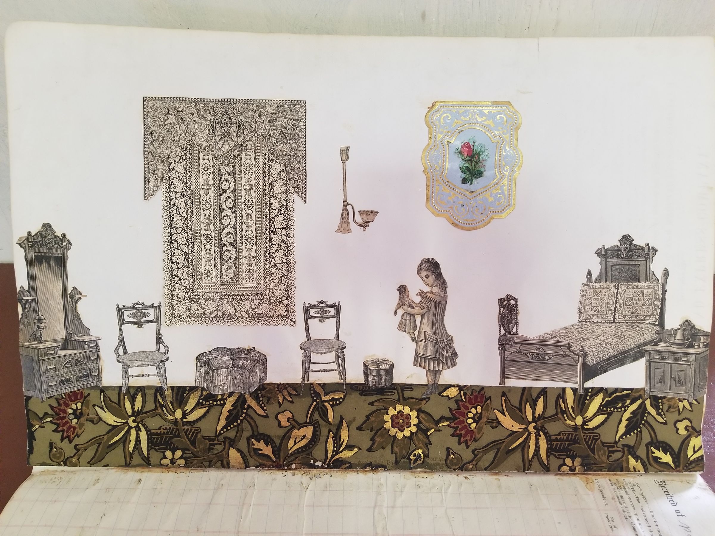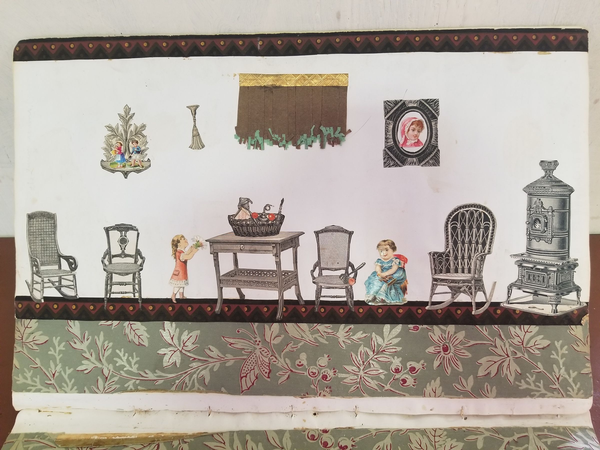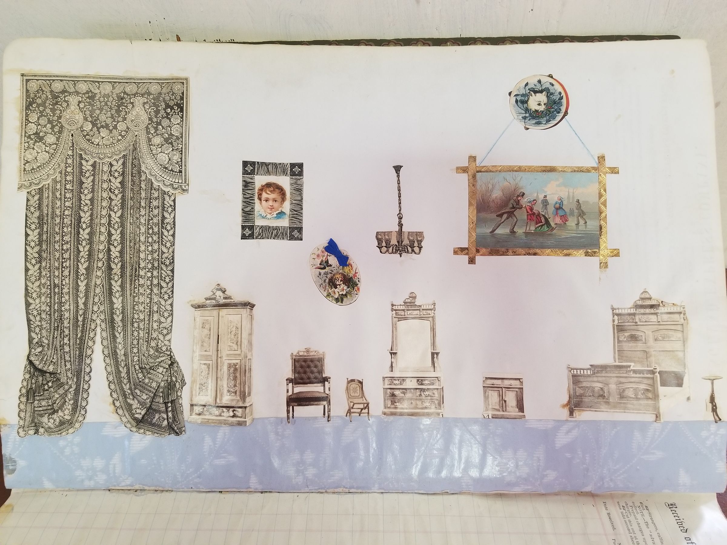 Handmade "dollhouse" made from a blank ledger book, 10.5" x 16"; Nancy Griffin as a child of about ten made a house for her paper dolls by cutting out pictures of furniture from catalogs, perhaps the Sears catalog, and pasting them into the pages of the ledger book along with strips of wallpaper for carpet and borders on the wallsUpdate Date