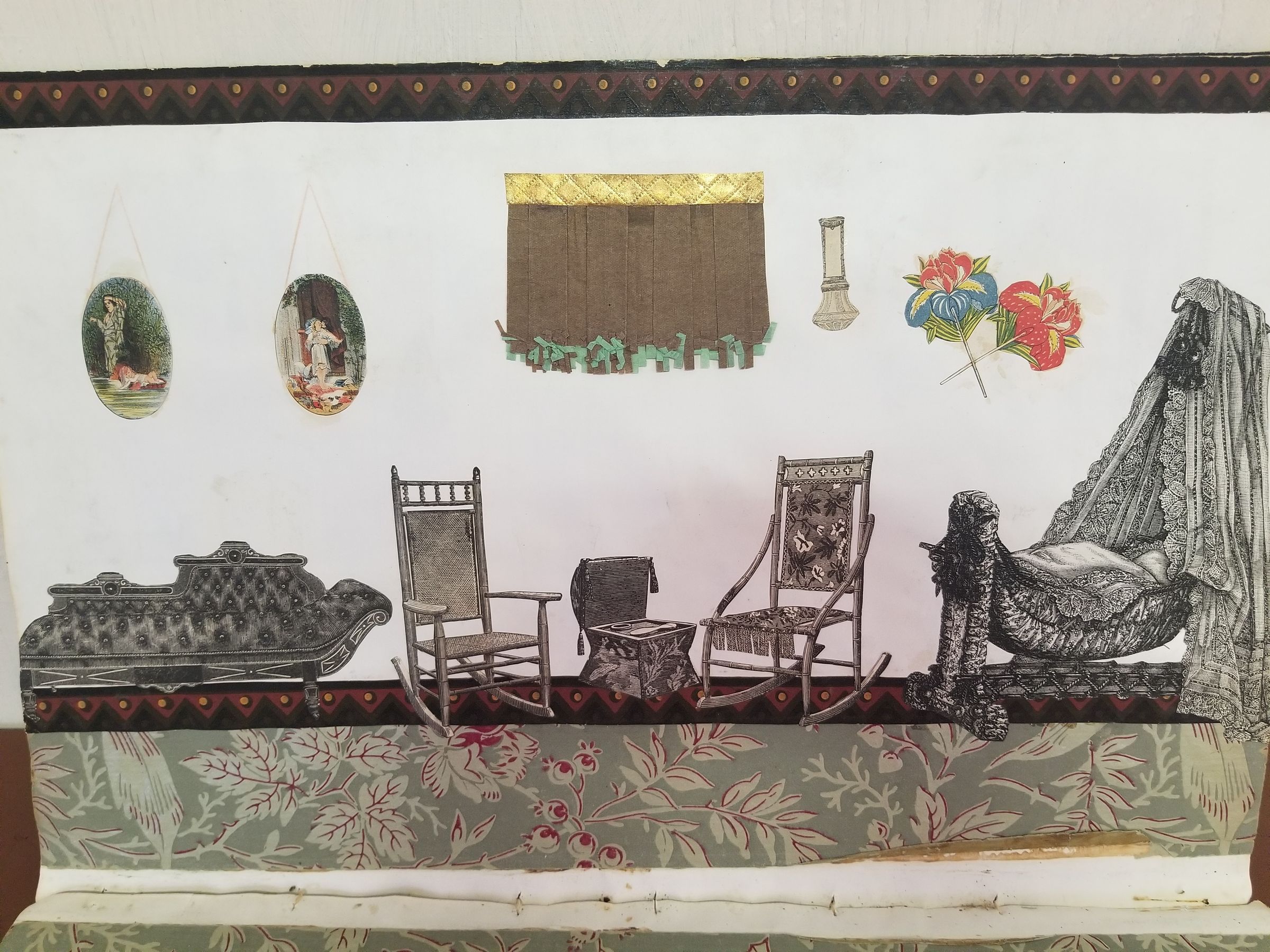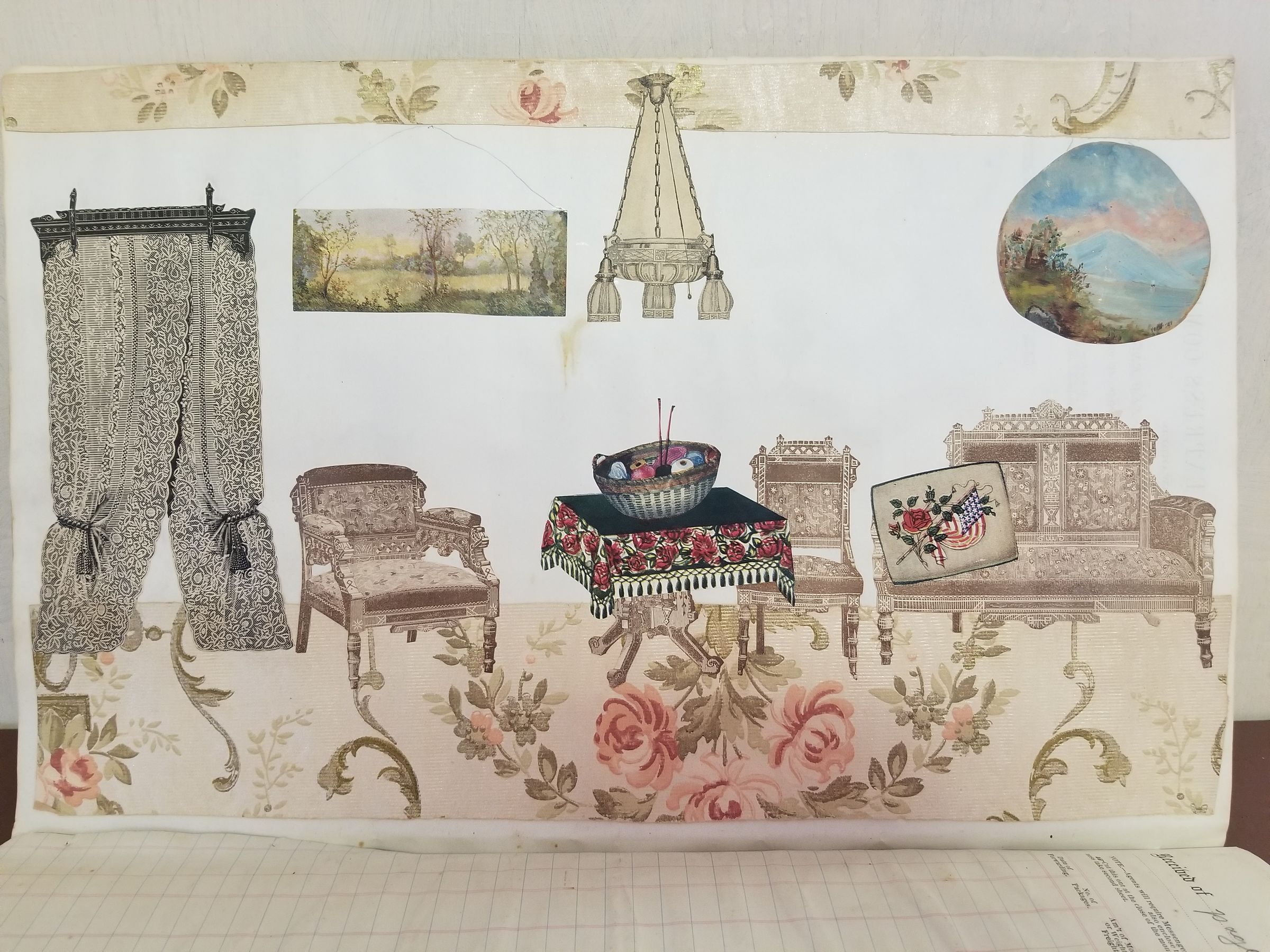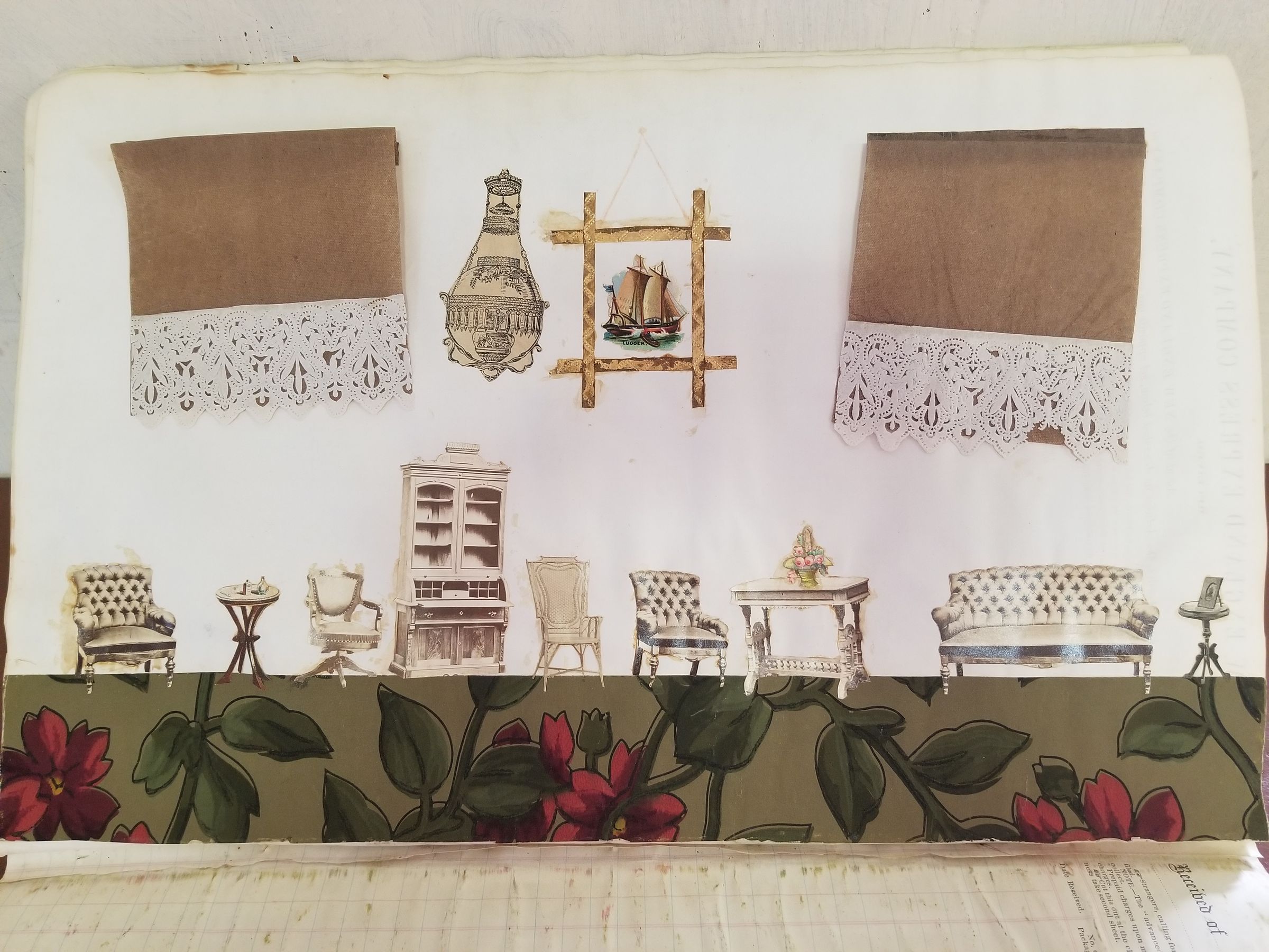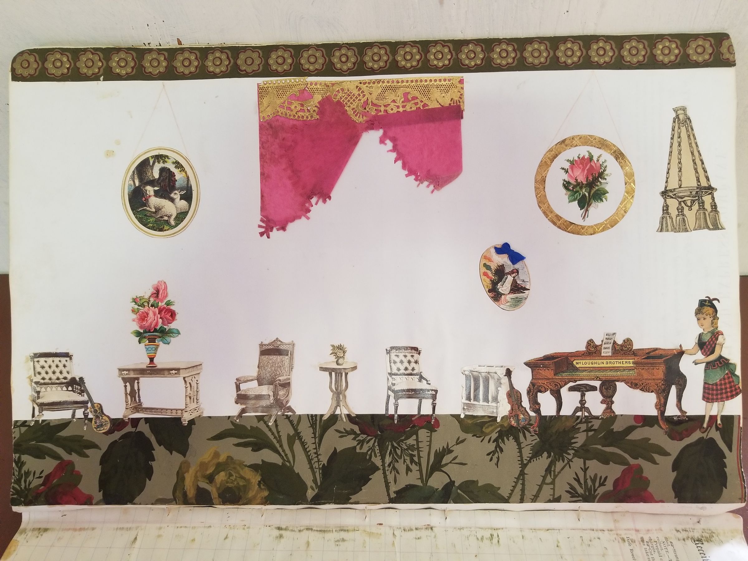 Handmade "dollhouse" made from a blank ledger book, 10.5" x 16"; Nancy Griffin as a child of about ten made a house for her paper dolls by cutting out pictures of furniture from catalogs, perhaps the Sears catalog, and pasting them into the pages of the ledger book along with strips of wallpaper for carpet and borders on the wallsUpdate Date
