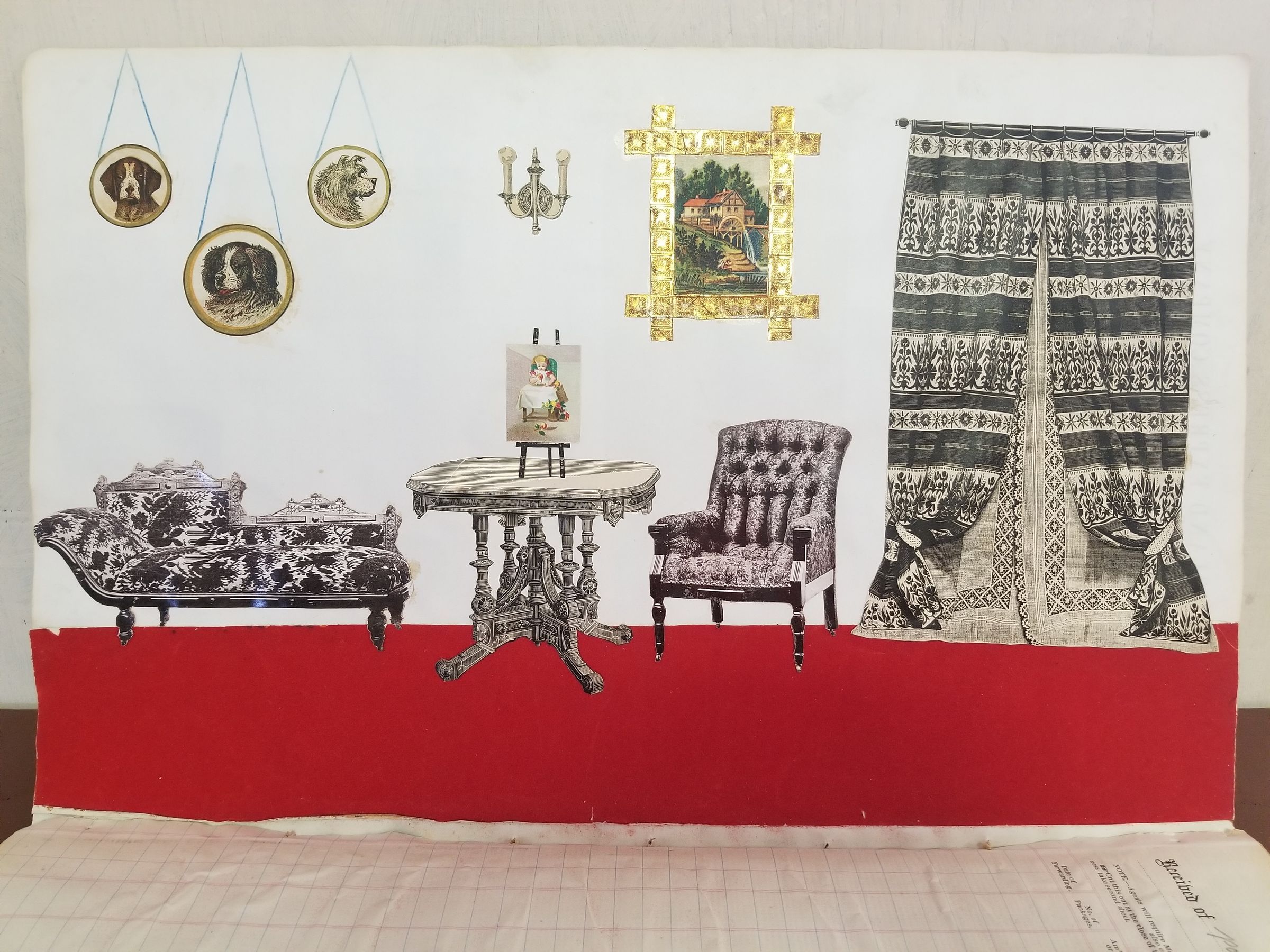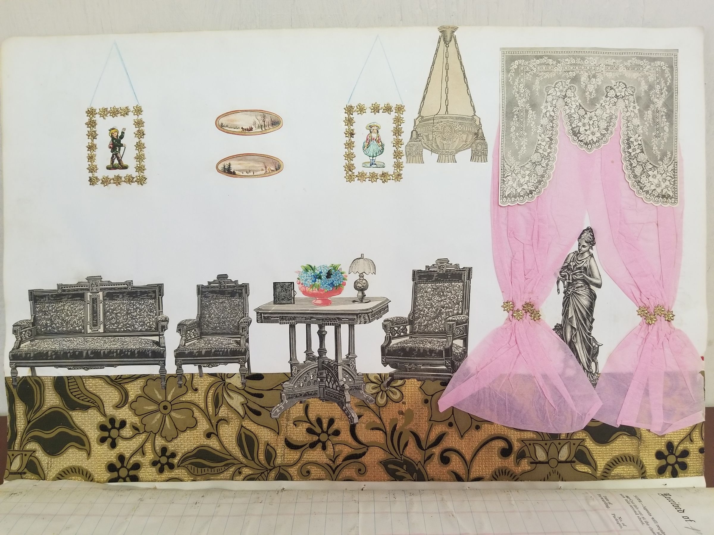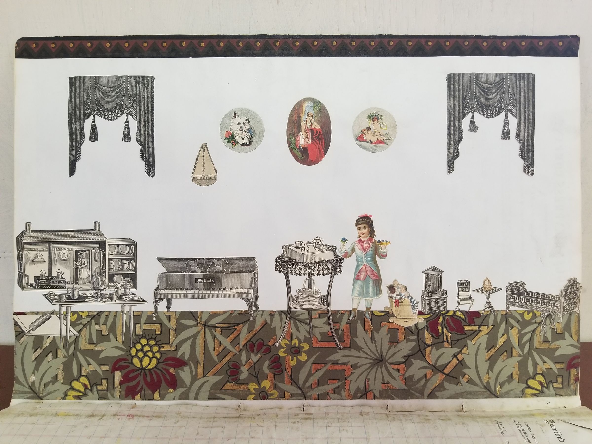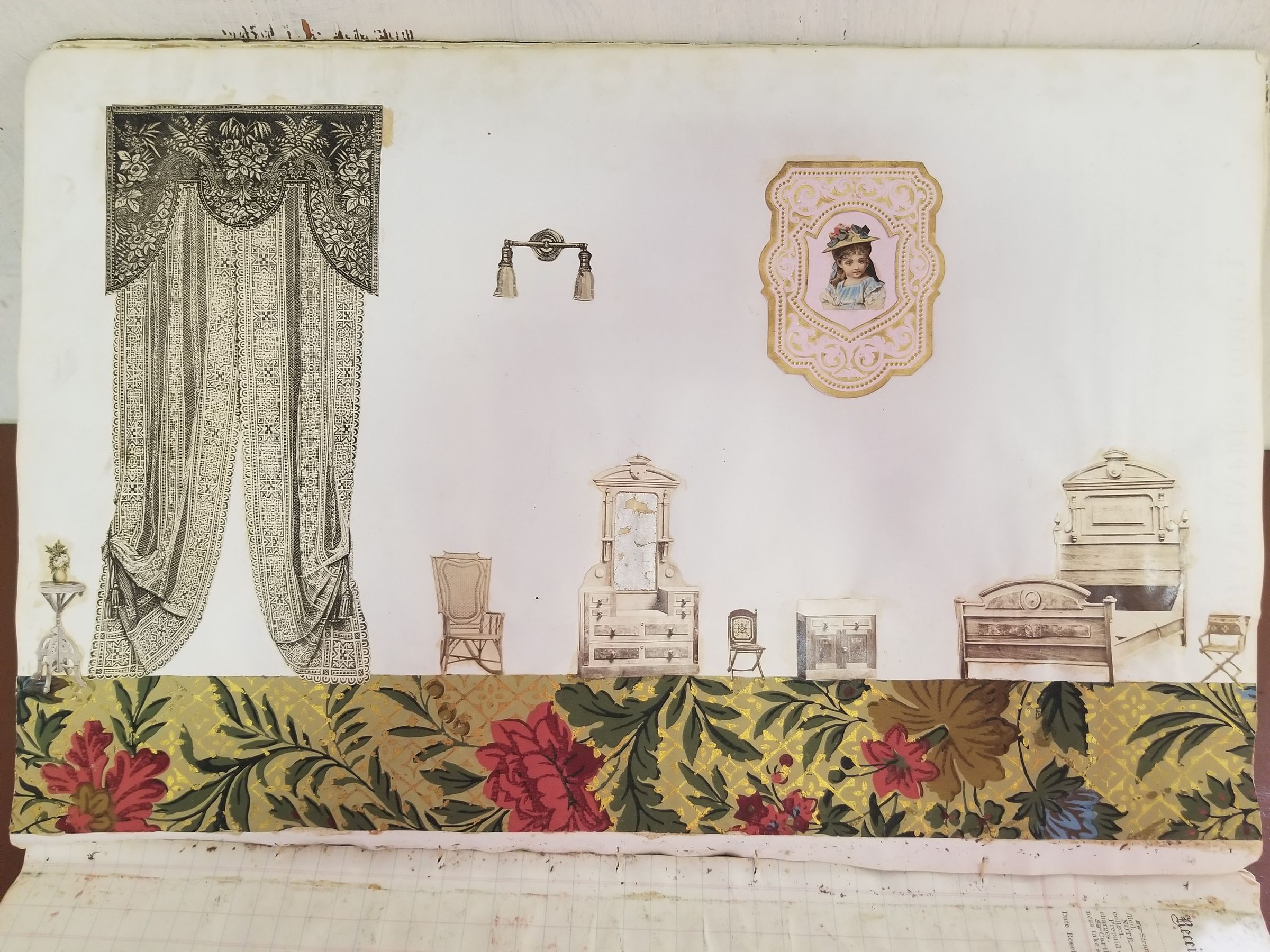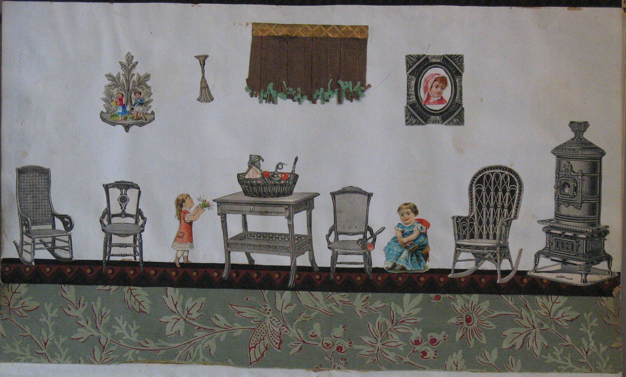 Handmade "dollhouse" made from a blank ledger book, 10.5" x 16"; Nancy Griffin as a child of about ten made a house for her paper dolls by cutting out pictures of furniture from catalogs, perhaps the Sears catalog, and pasting them into the pages of the ledger book along with strips of wallpaper for carpet and borders on the wallsUpdate Date