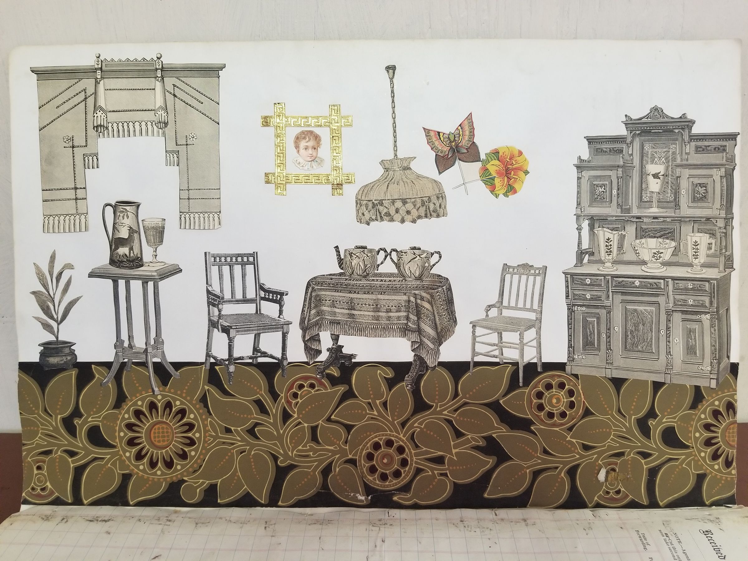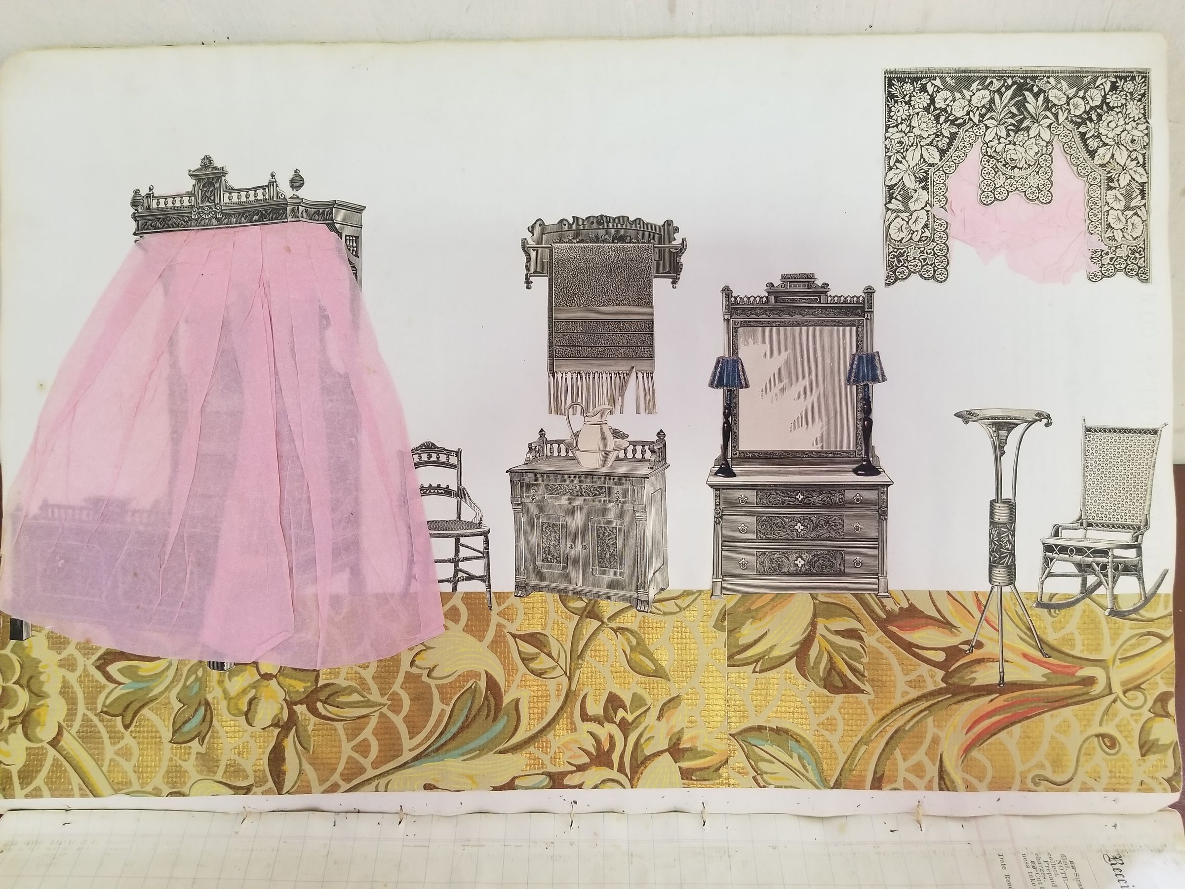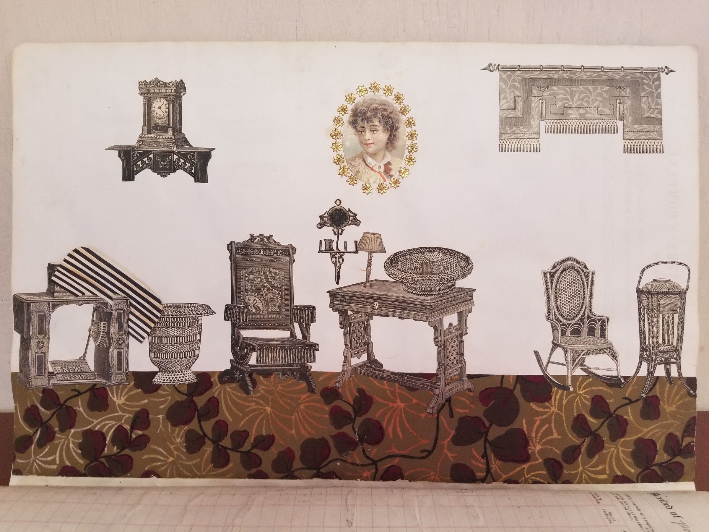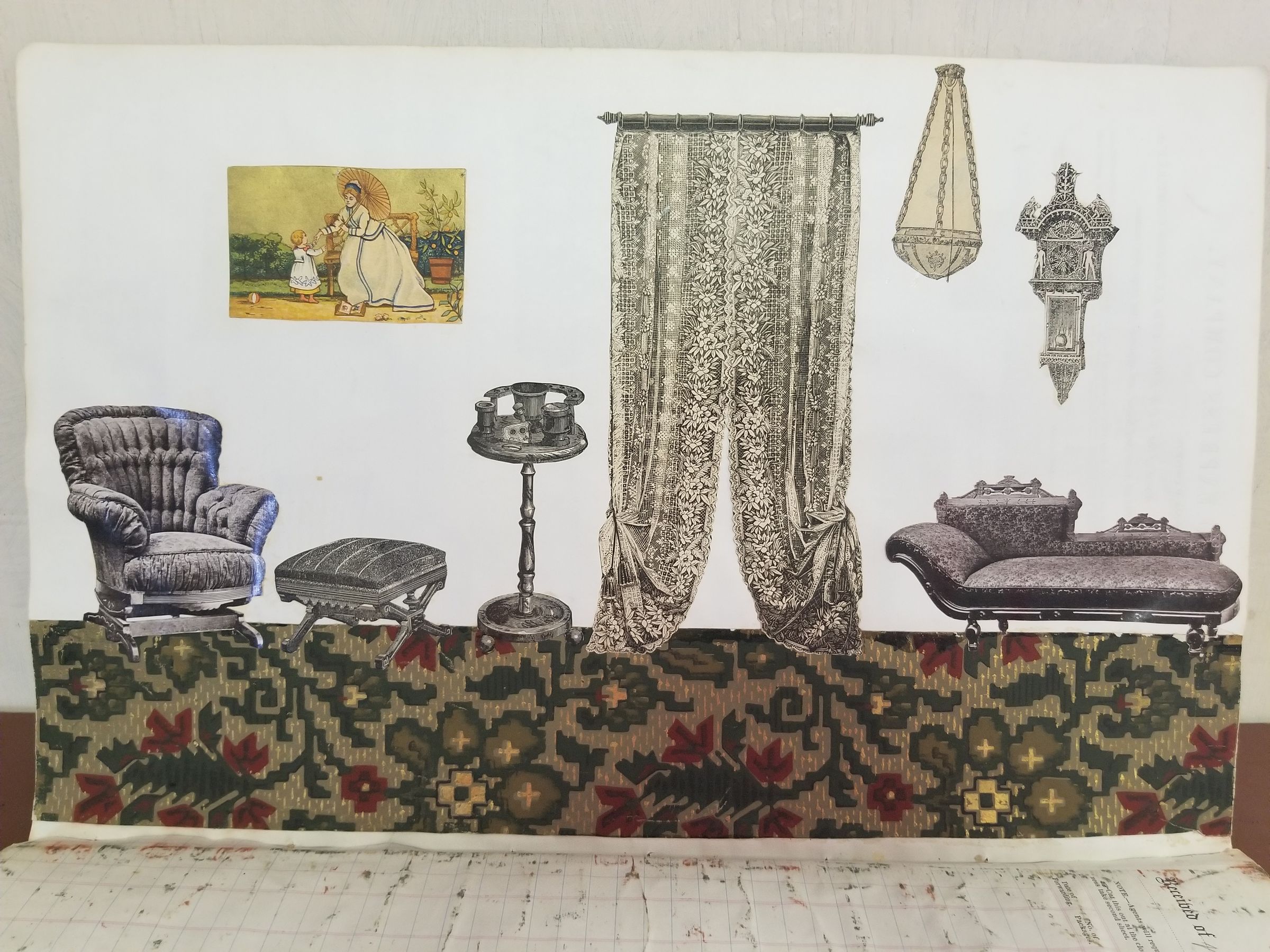 Handmade "dollhouse" made from a blank ledger book, 10.5" x 16"; Nancy Griffin as a child of about ten made a house for her paper dolls by cutting out pictures of furniture from catalogs, perhaps the Sears catalog, and pasting them into the pages of the ledger book along with strips of wallpaper for carpet and borders on the wallsUpdate Date