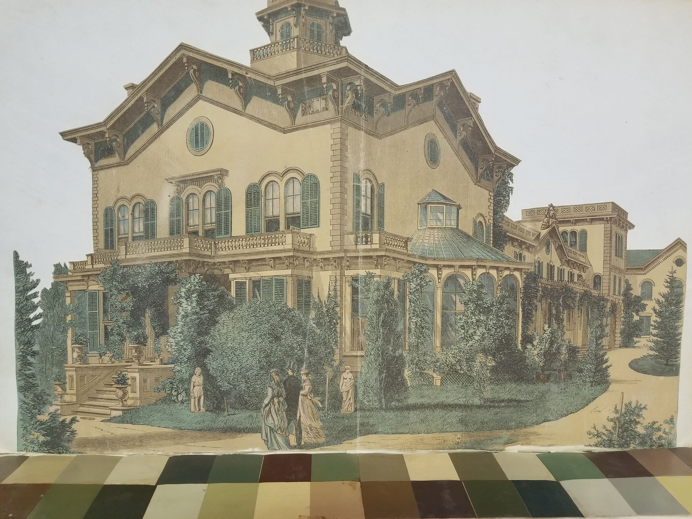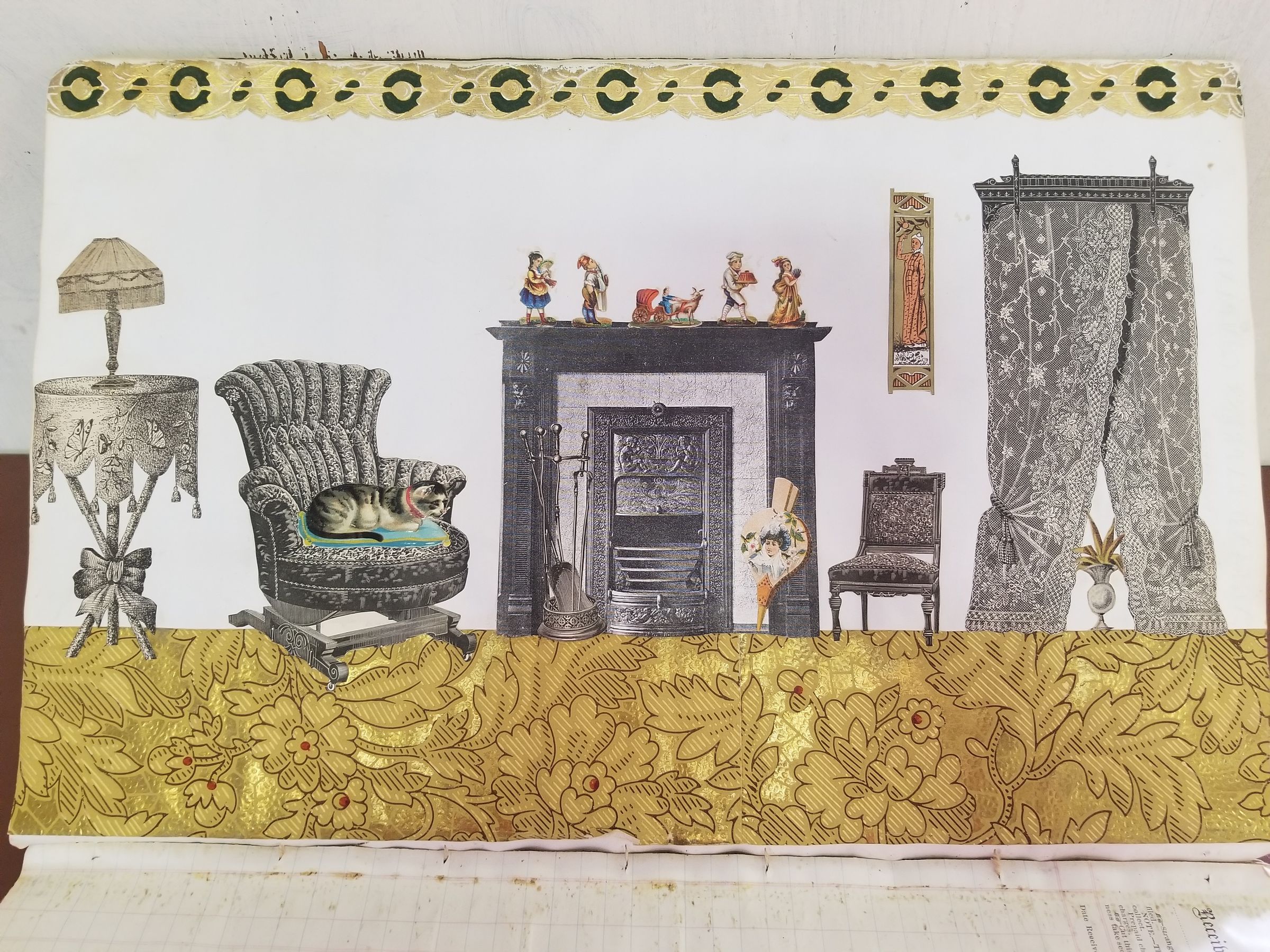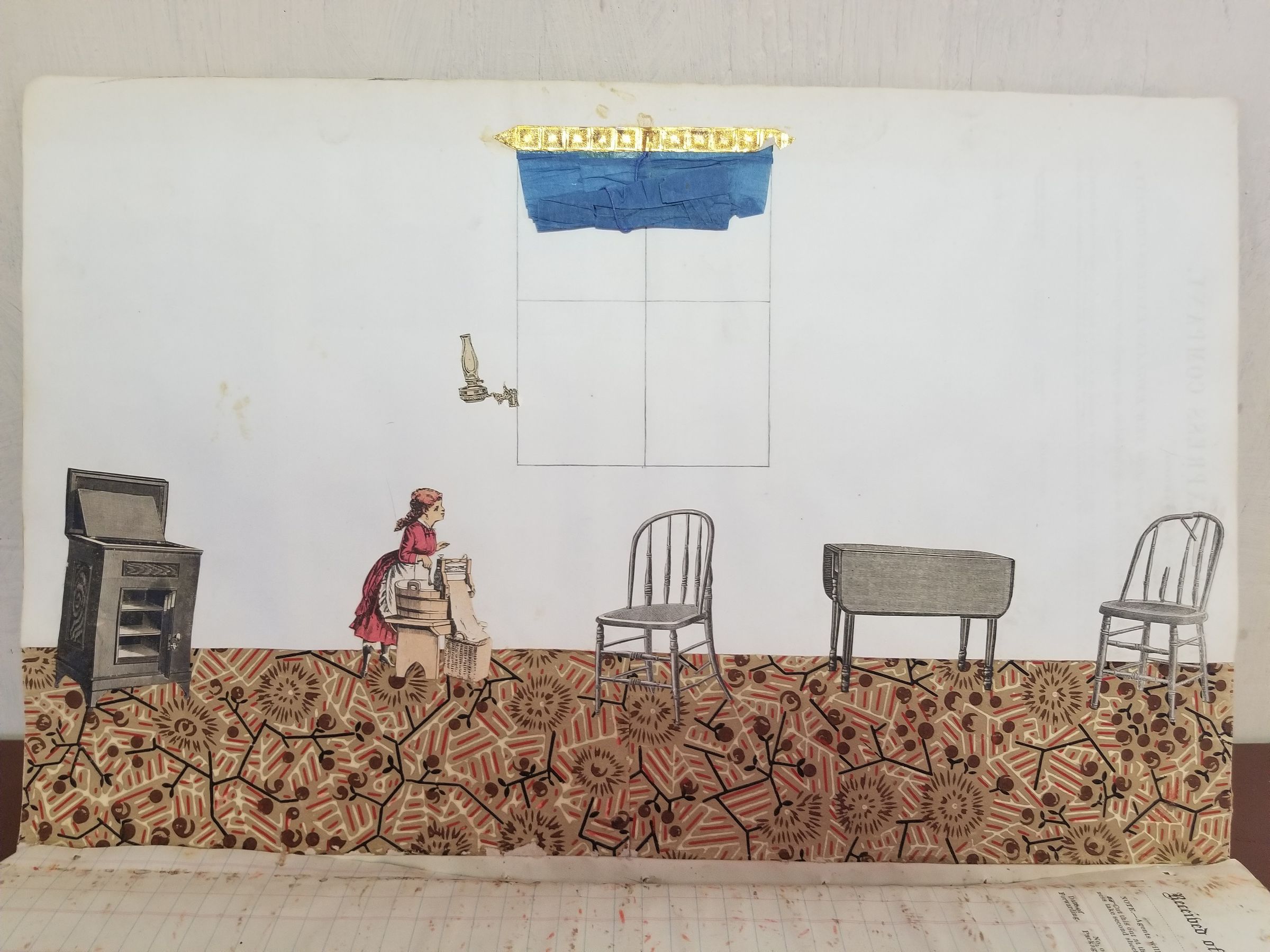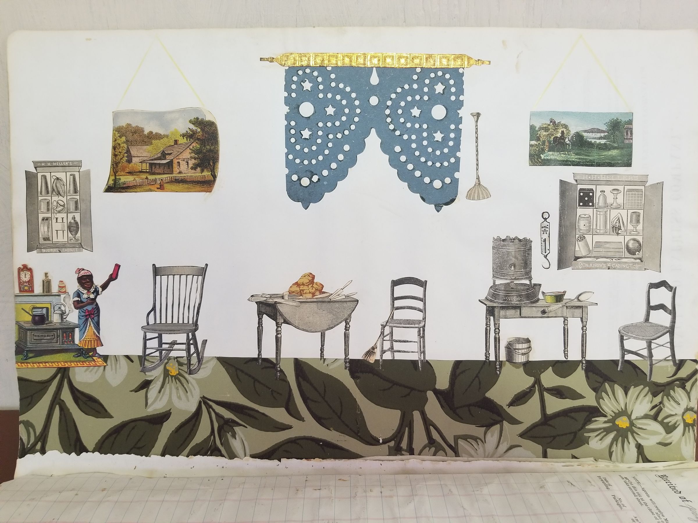 Handmade "dollhouse" made from a blank ledger book, 10.5" x 16"; Nancy Griffin as a child of about ten made a house for her paper dolls by cutting out pictures of furniture from catalogs, perhaps the Sears catalog, and pasting them into the pages of the ledger book along with strips of wallpaper for carpet and borders on the wallsUpdate Date