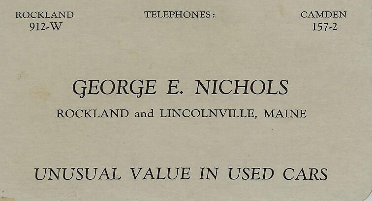 Card advertising George E. Nichols used cars. Lincolnville and Rockland telephone numbers appear on card.