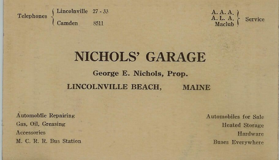 Card advertising Nichol's Garage, Lincolnville, Maine and the services provided. Automobile repairing, gas, oil, greasing,accessories, heated storage, automobiles for sale, hardware. Also serves as MCRR Bus Station. On reverse side of card, a schedule shows distances from Lincolnville to other cities and towns in Maine.Update Date