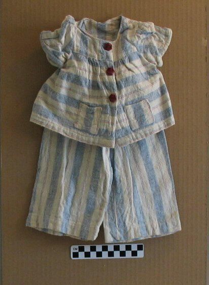 pair of pajamas for a doll, blue and white striped cotton flannel, brown buttonsRelationships