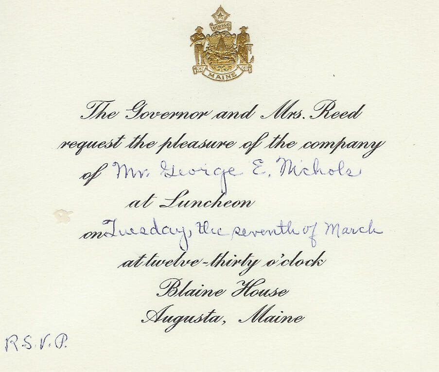 Invitation sent to George E. Nichols by Governor and Mrs. Reed to a luncheon at the Blaine House, Augusta, Maine.