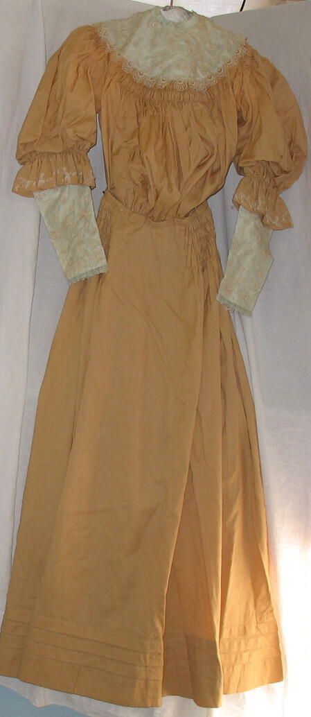 two piece dress, gold-colored polished cotton, long mutton sleeves, blue organza-lace tight cuffs and inset in yoke; hand-sewn