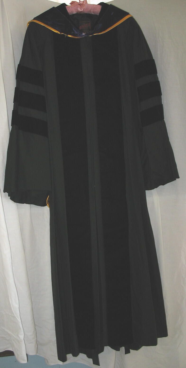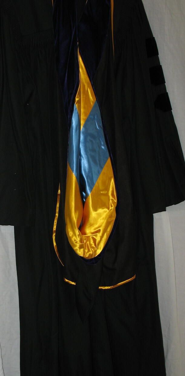 black academic gown, velvet stripes on sleeves with academic hood in blue and gold, with purple velvet on outside