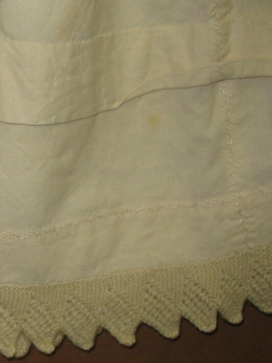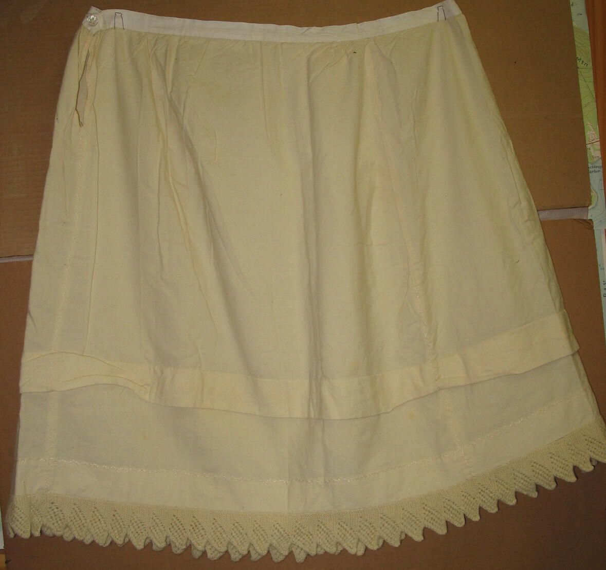 petticoat has a four inch tuck in the length; it must have been made when skirts were floor length, and then altered for shorter skirts later.
