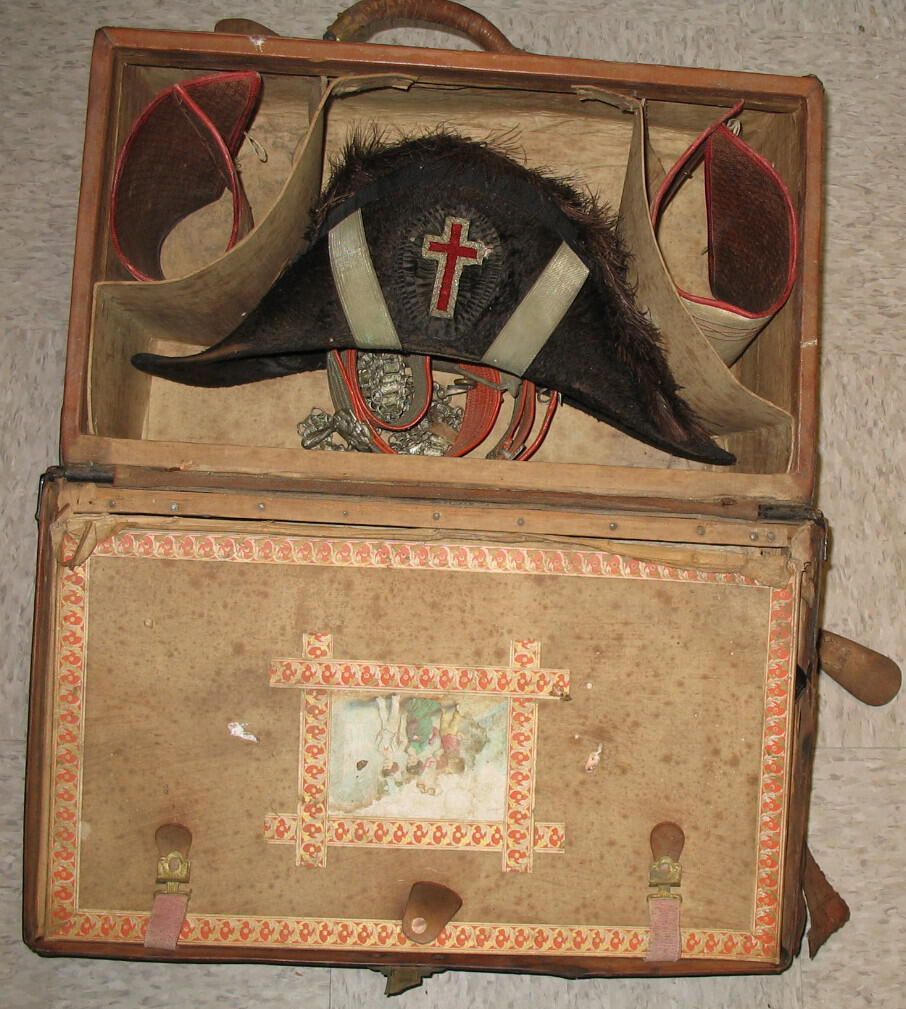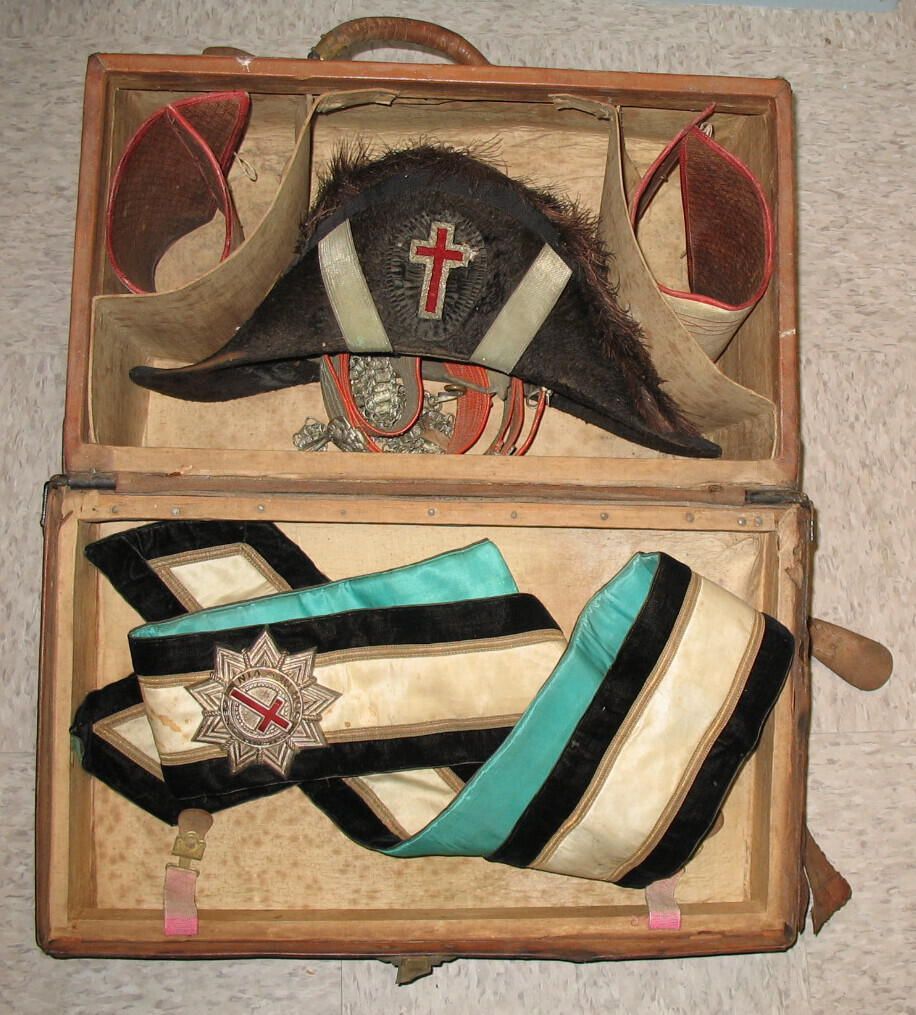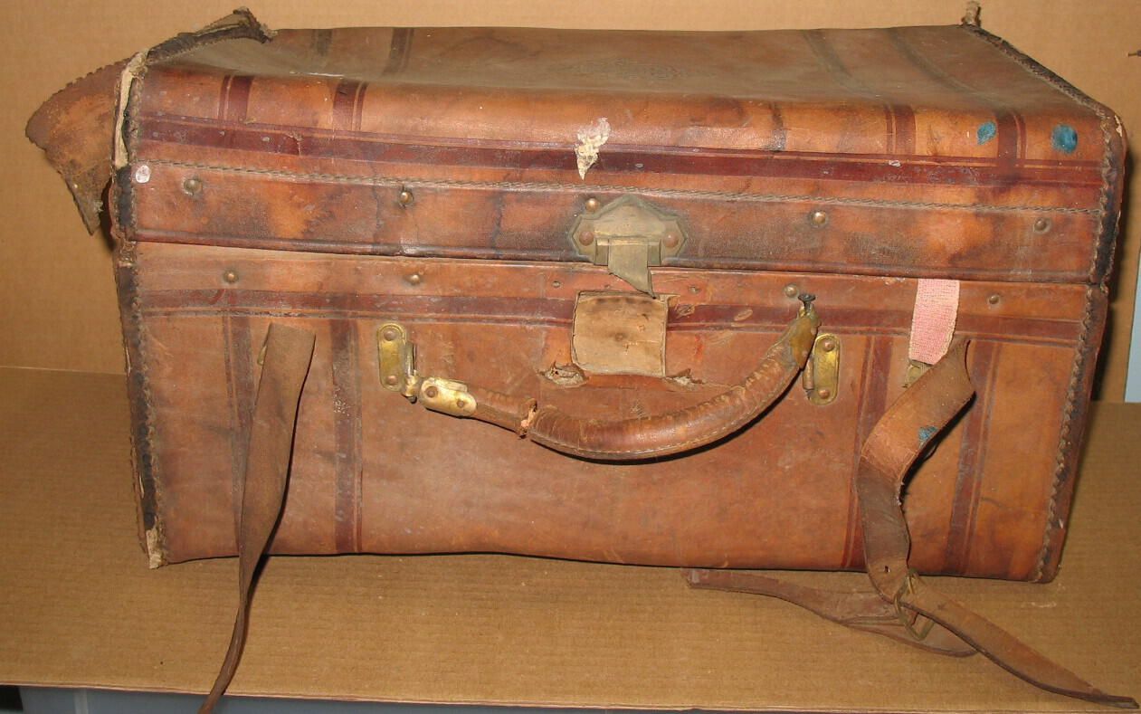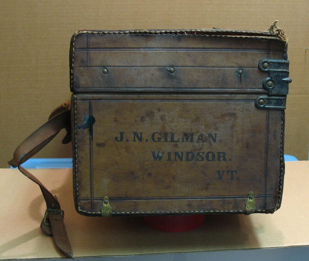 leather case, compartmented inside to hold specific items "R.N. Gilman, Windsor, VT" stenciled on one end lock broken, handle fastener broken\