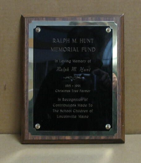 wood and metal plaque reads: "In loving memory of Ralph M. Hunt 1915-1991 Christmas Tree Farmer. In recognition of contributions made to the school children of Lincolnvillus.e, Maine"