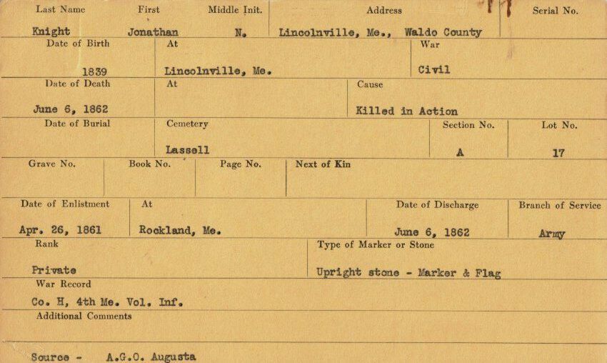 Military records of Jonathan N. Knight who was killed in action during the Civil War.Relationships