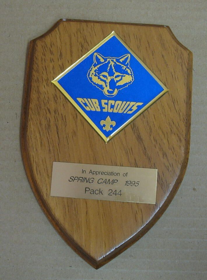 wooden plaque with brass plate Cub Scouts Pack 244 "In appreciation of Spring Camp, 1995"