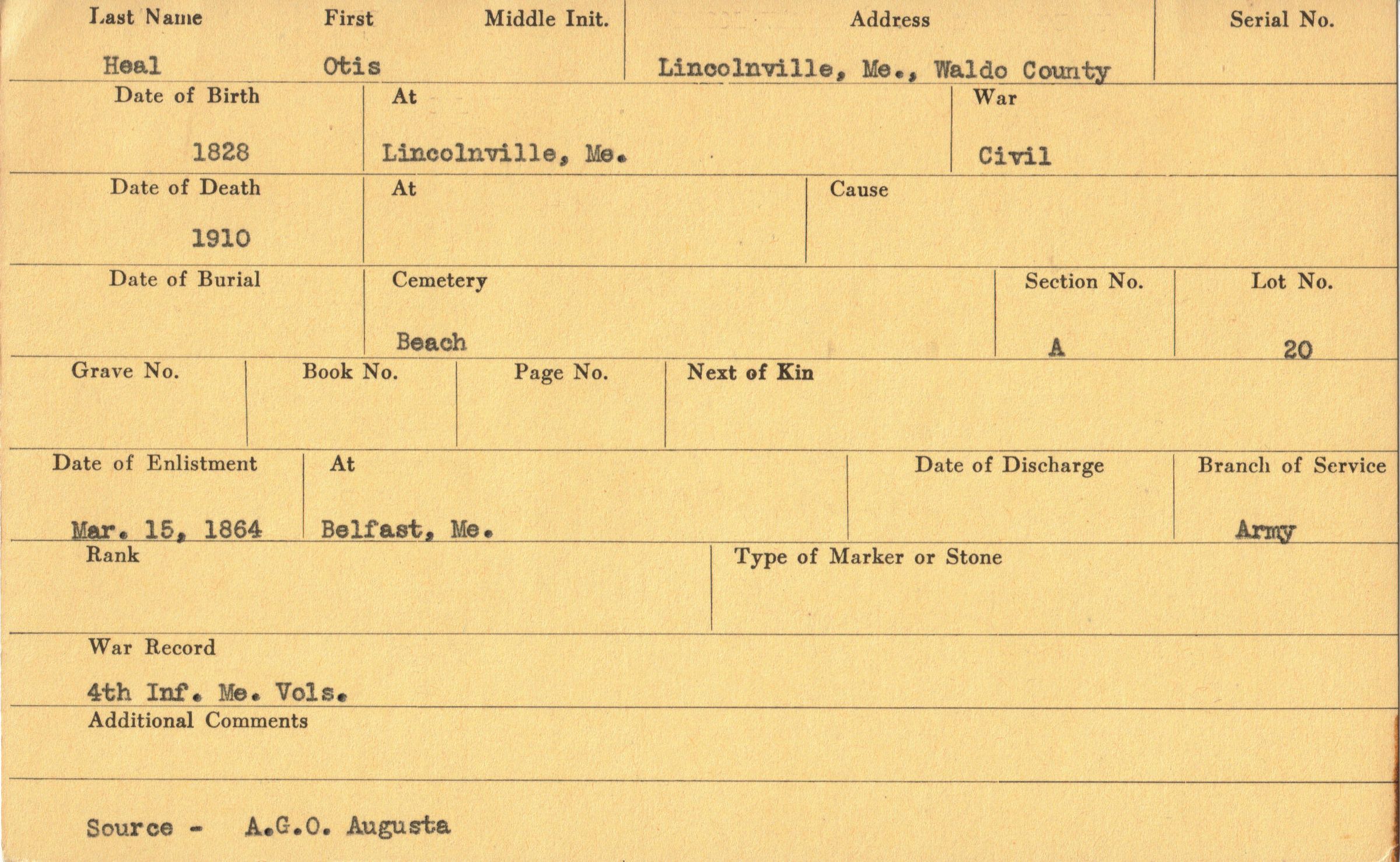 Military records of Otis Heal who served in the Civil War.