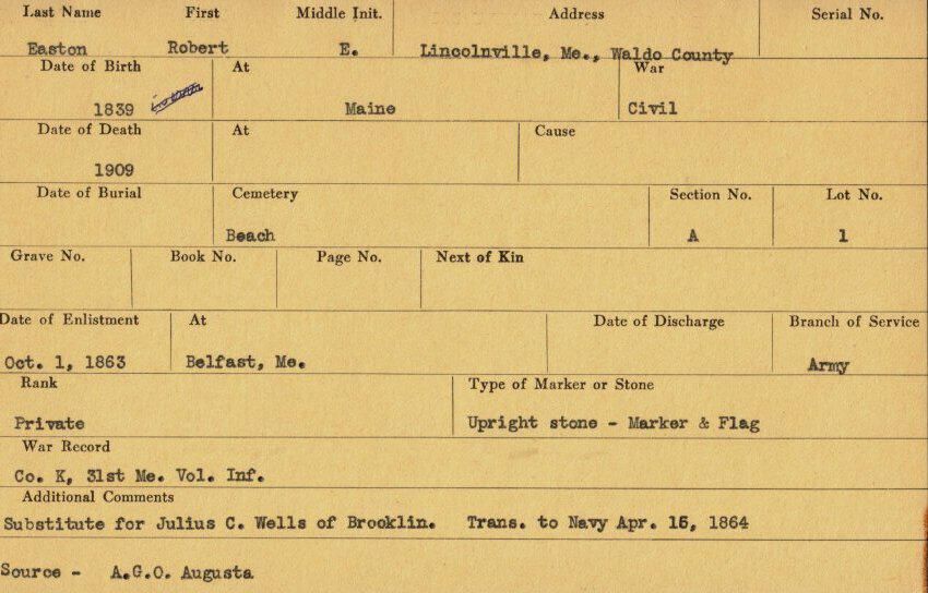 Military records of Robert E. Easton who served in the Civil War.Relationships