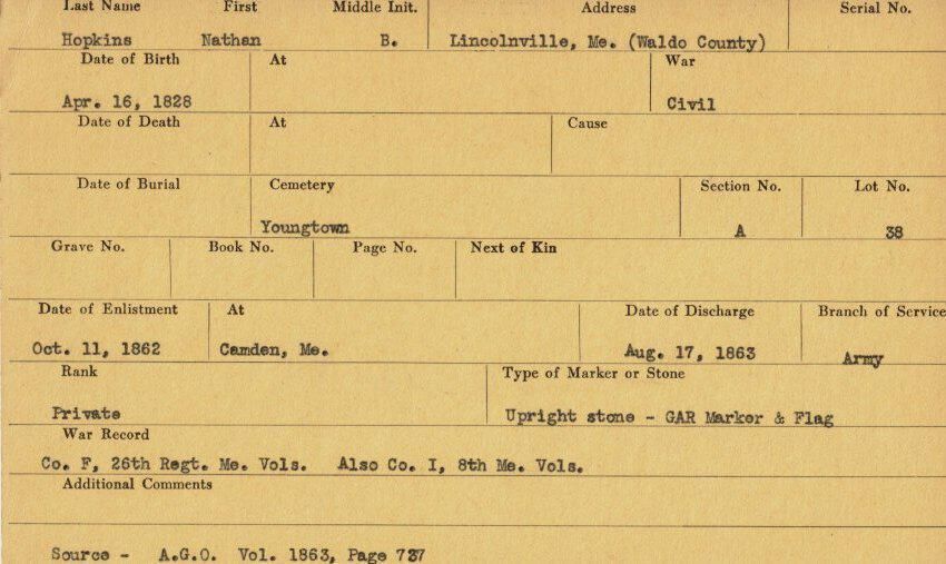 Military records of Nathan B. Hopkins who served in the Civil War.Relationships