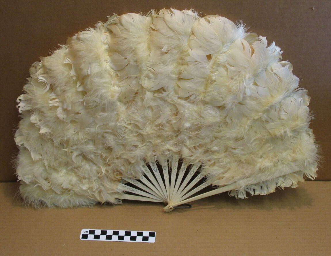 ivory and feather fan, 13.5" long carved ivory ribs with metal loop at end thickly covered with white (or once white) feathers