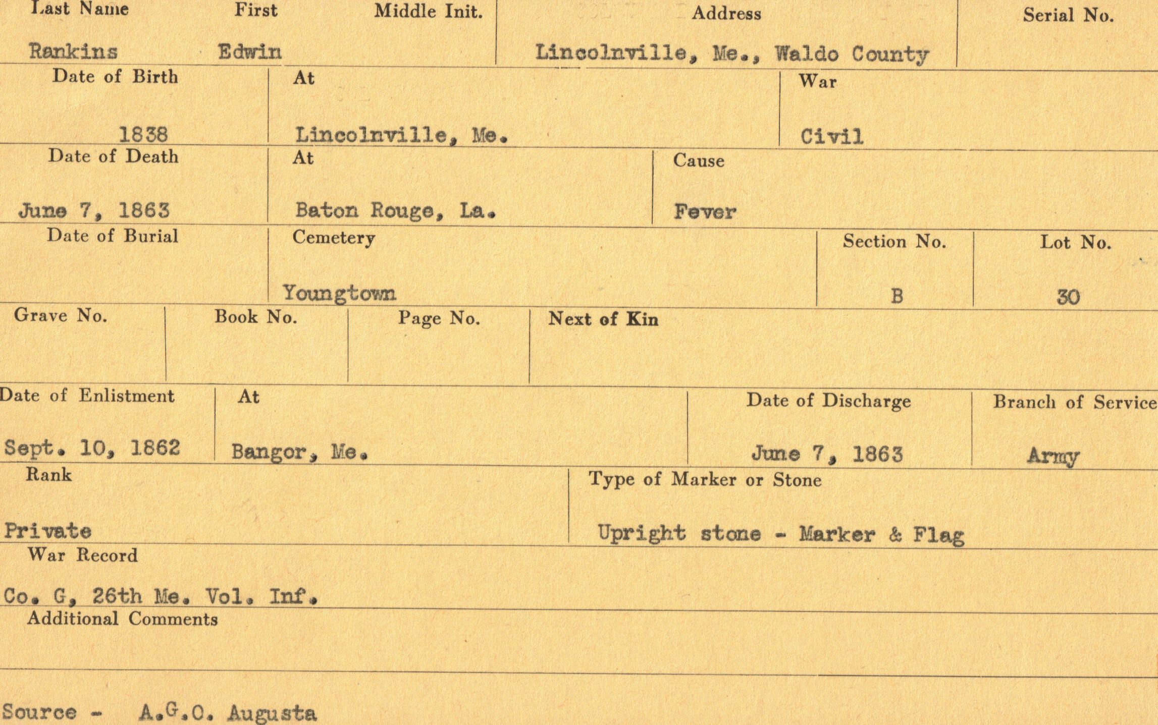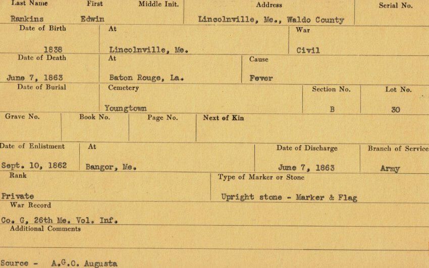 Military records of Edwin Rankins who served in the Civil War.Relationships