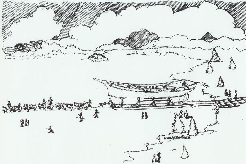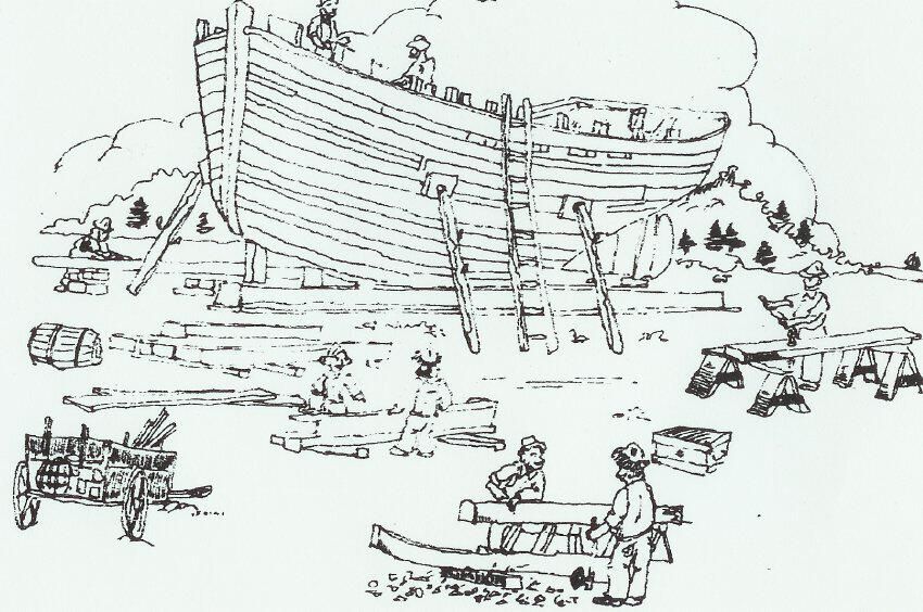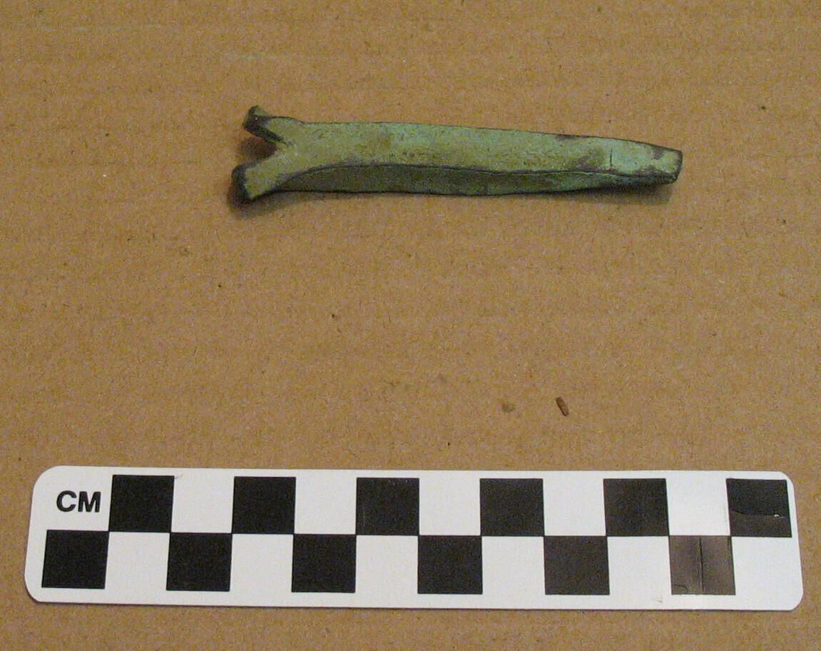 3'" long hand-forged brass nail, green with patina found on the probable site where the schooner Forest was built (see below)